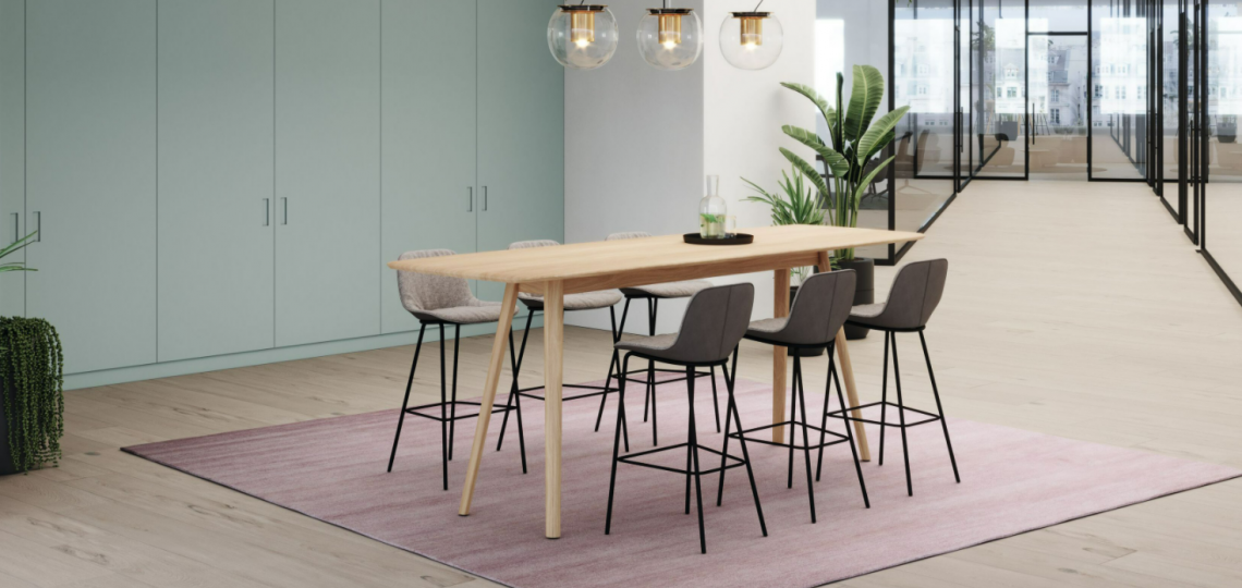 The high table for conversations at eye level. In executive offices, creative spaces, bistros or kitchens, Deen High Standing Table becomes an ideal meeting place. The slim, oval table top with soft edges creates a feeling of closeness and trust, and the design stands freely in the room on slim legs.