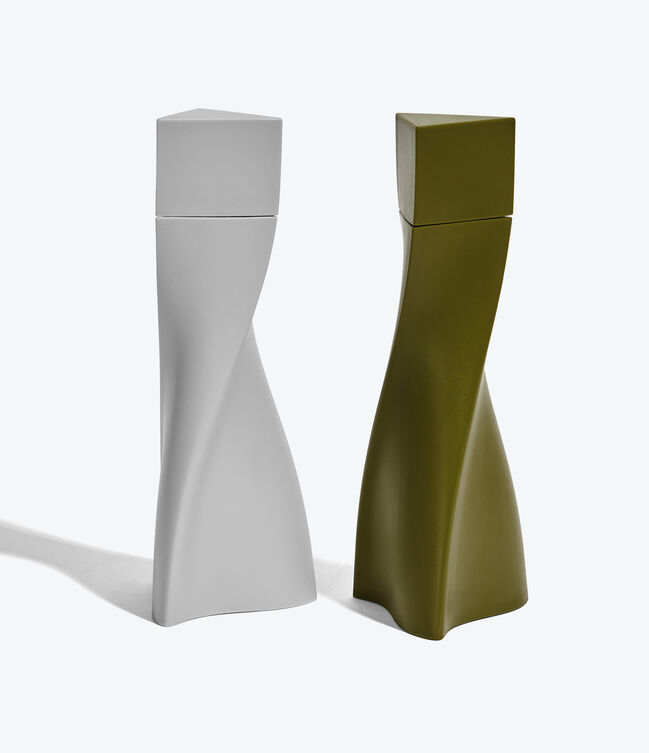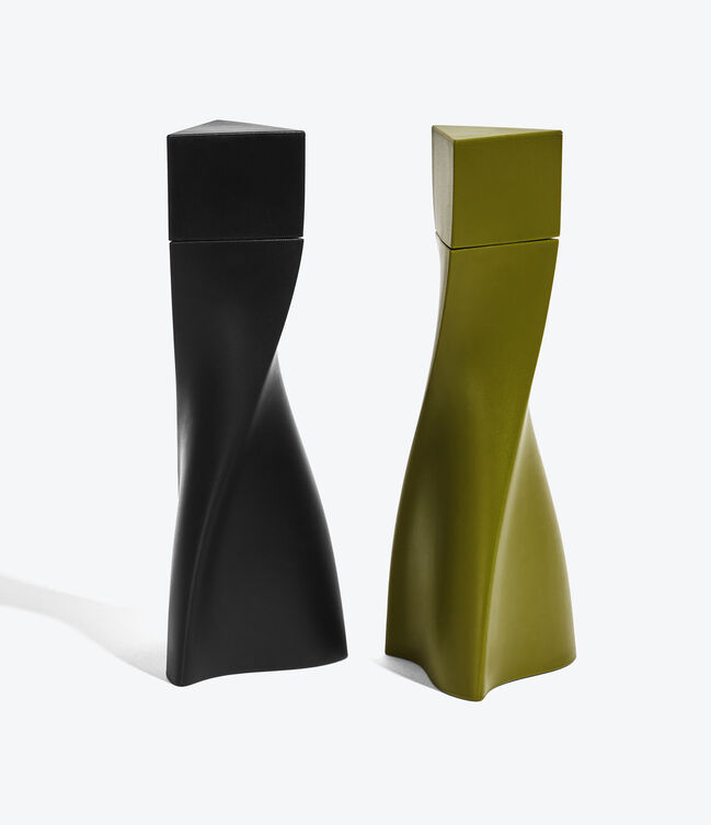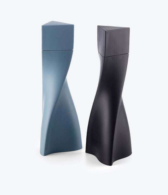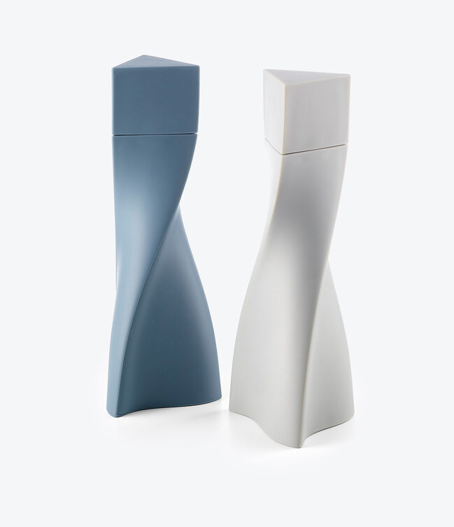 DUO Salt and Pepper Grinder - in a soft-touch plastic with two-parts - each twisting vertically from a three-pointed base to a triangular peak.