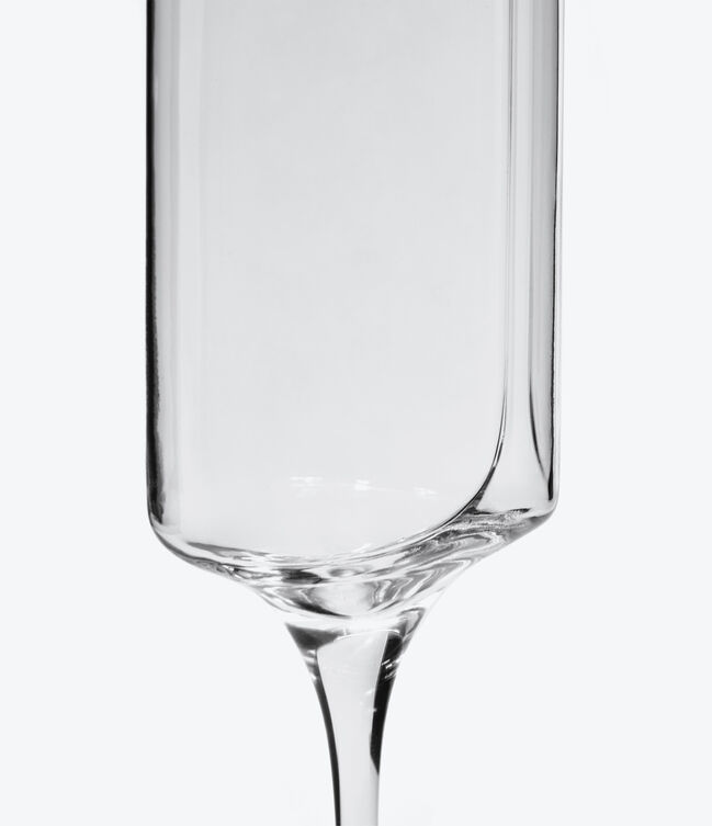HEW Champagne Flute Set of 2, polished blown glass - a subtle indentation carves the surface - creating a channel that extends and widens from the rim to merge seamlessly.