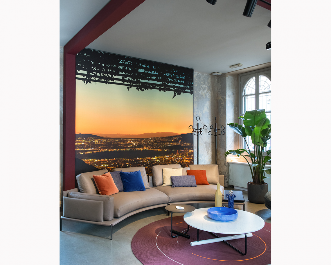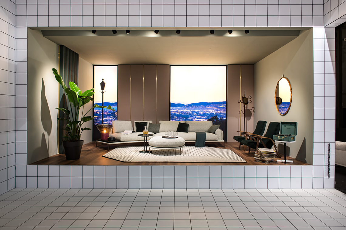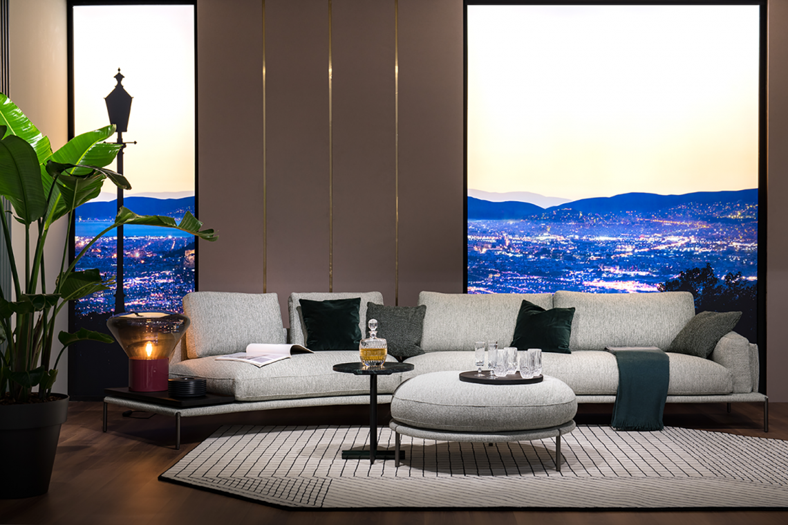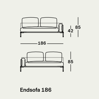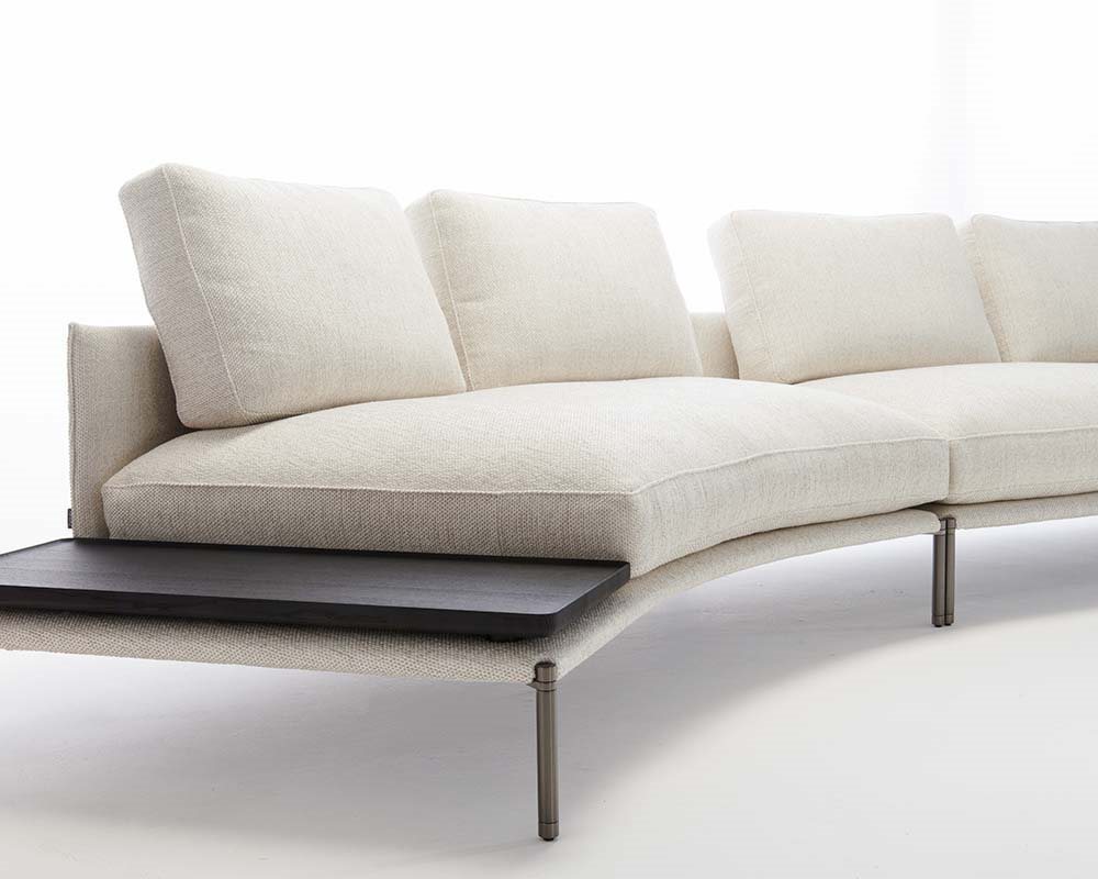 拋光黑色鍍鎳緞面或石墨黑漆面鋼質支腳。不銹鋼架結構。彈力條懸掛在結構上。單個坐墊內芯填充再生和可再生充聚氨酯/聚酯絮絨。靠墊內芯填充100%新鵝絨。再生和可再生聚酯絮絨作為扶手墊內芯填充物。筆直與彎型終端元件可配備扶手墊,或在沙發的支撐底座上配備開放式黑漆實心白蠟木托盤。表面覆蓋可拆卸面料或真皮。 配備直徑為45厘米的開放式黑漆實心白蠟木托盤,可自由放置在座墊上。四周鑲板覆蓋與抱枕同樣的面料或真皮。