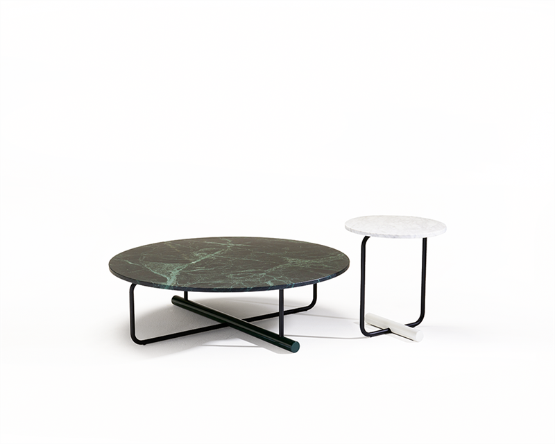 啞光黑漆鋼結(jié)構(gòu)。90種顏色皮革包覆的鋼制桌面,有金色0814、黑色0801、無煙煤色0807和泥色0841,支腳采用亮黑色漆山毛櫸木,也有白色卡拉拉大理石或錦緞大理石桌面,20毫米厚,白色可選光面或光面綠漆山毛櫸腳。