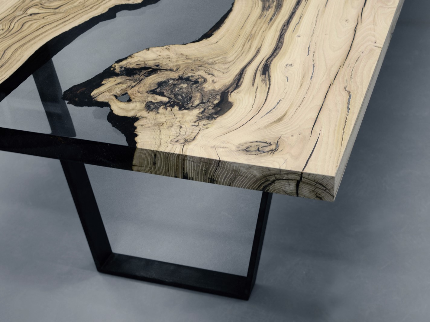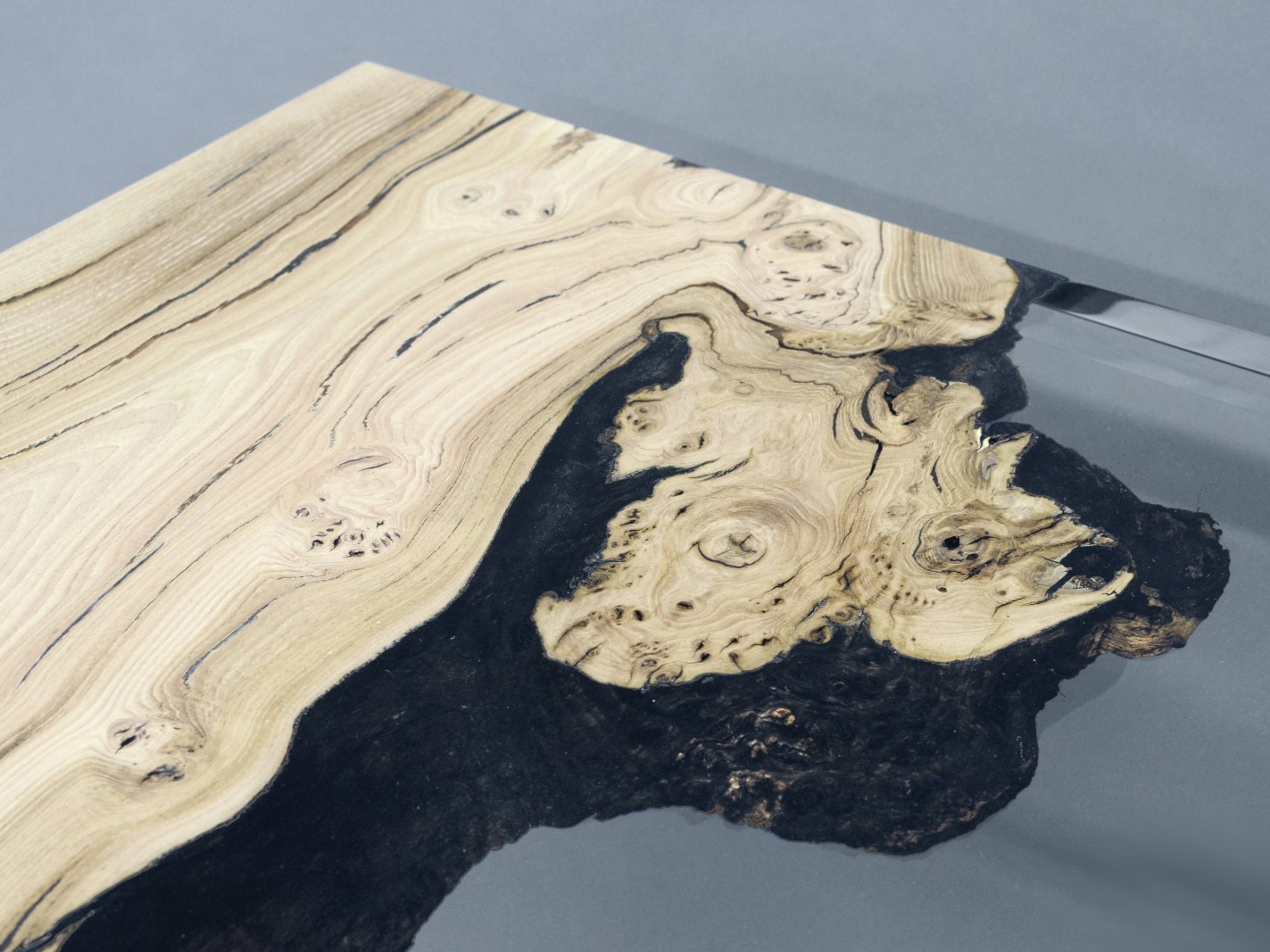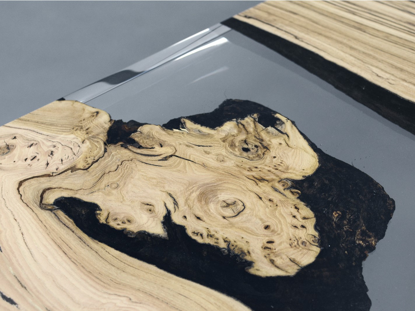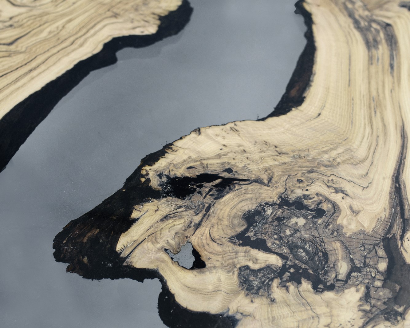 Natural Wood surface not covered by resin on the section planes. Selective wood coating with matt natural effect.