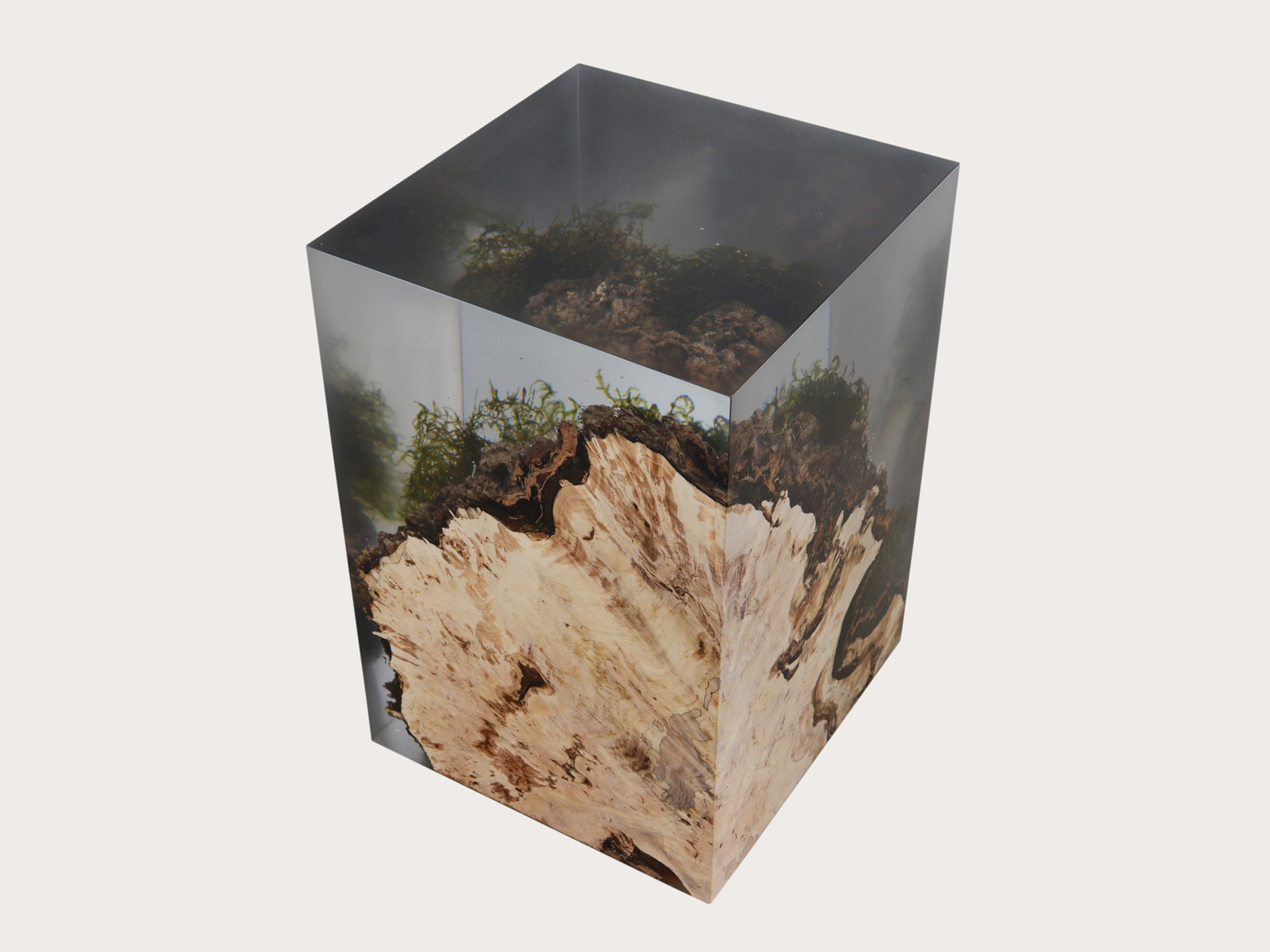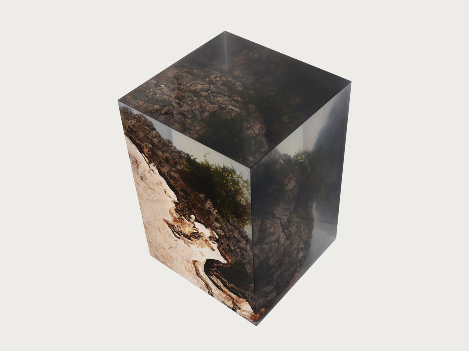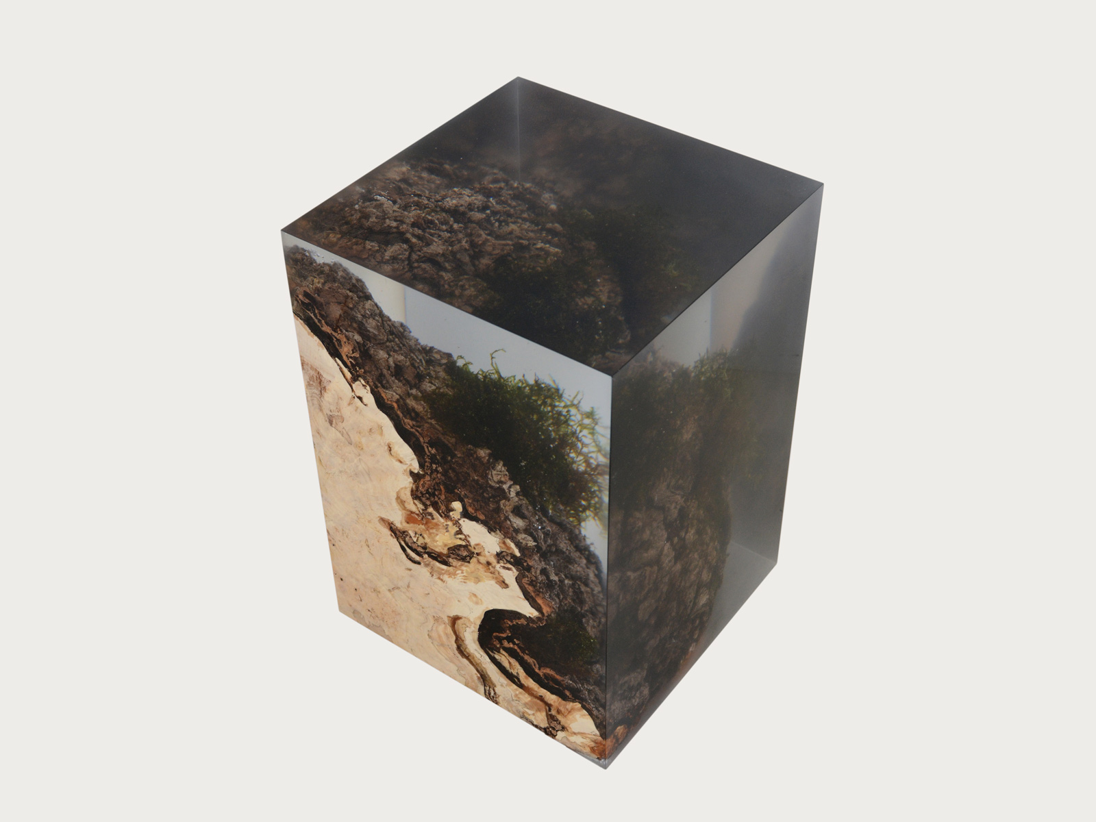 alcarol recover discarded pieces of logs from the undergrowth of the Italian Dolomite mountains and preserve the natural bark surface with their native populations of plants, which are embedded in a resin resembling the water that generated their life.