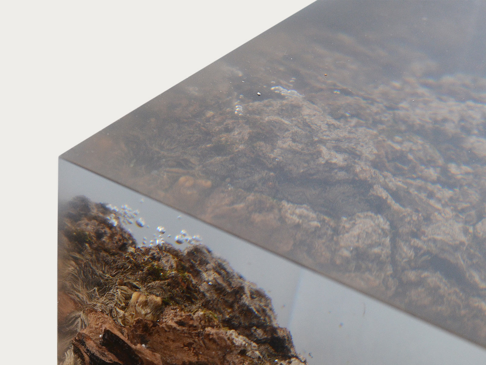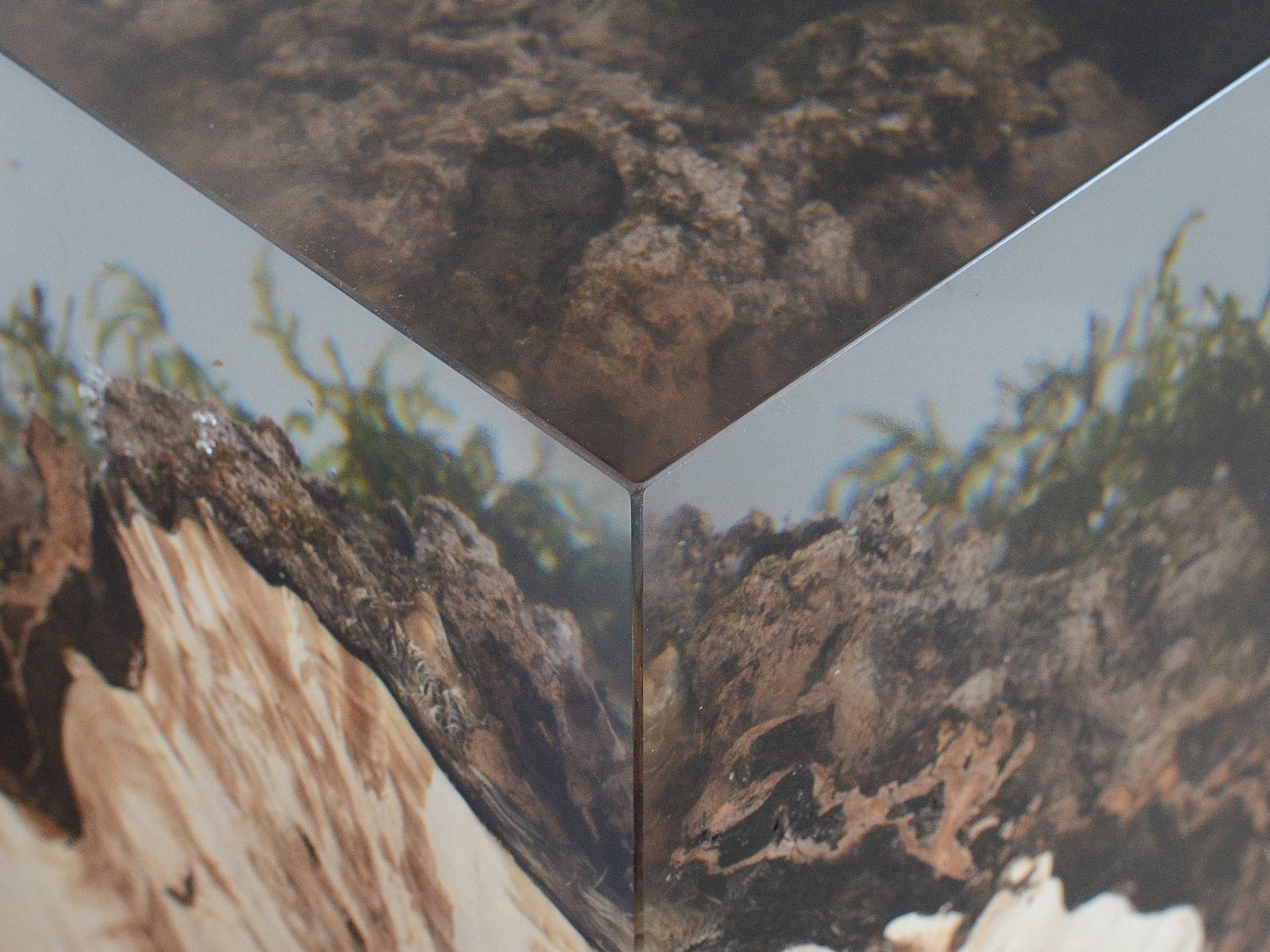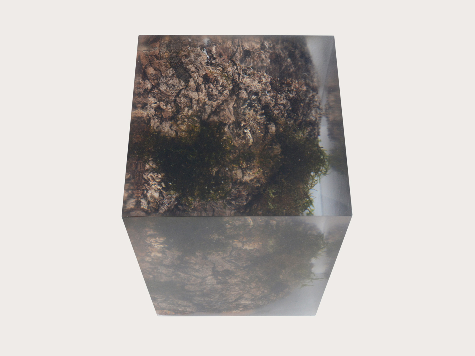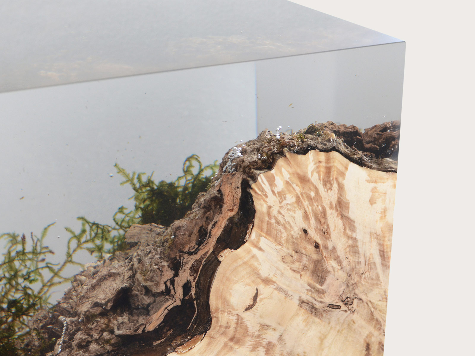 alcarol recover discarded pieces of logs from the undergrowth of the Italian Dolomite mountains and preserve the natural bark surface with their native populations of plants, which are embedded in a resin resembling the water that generated their life.