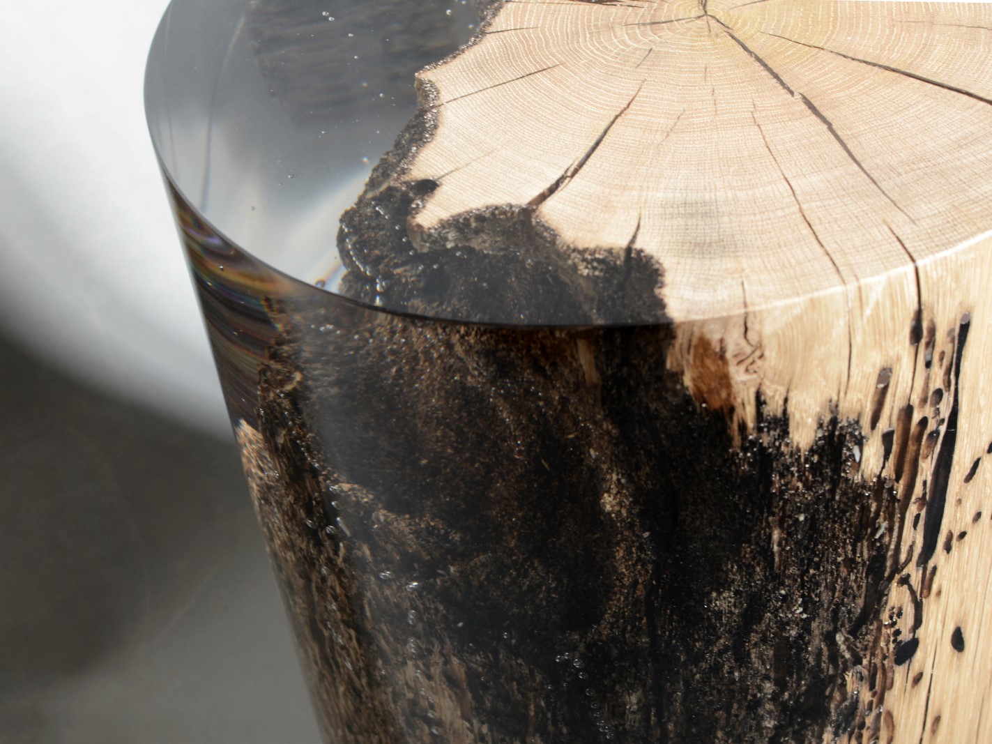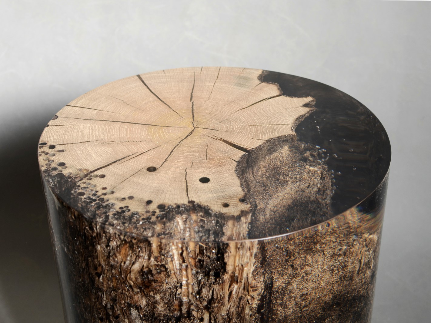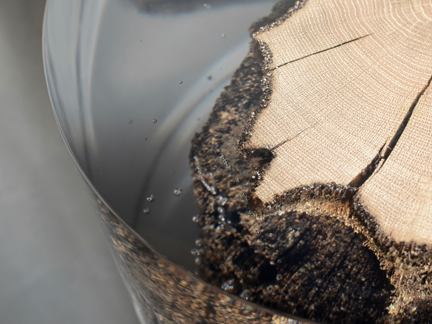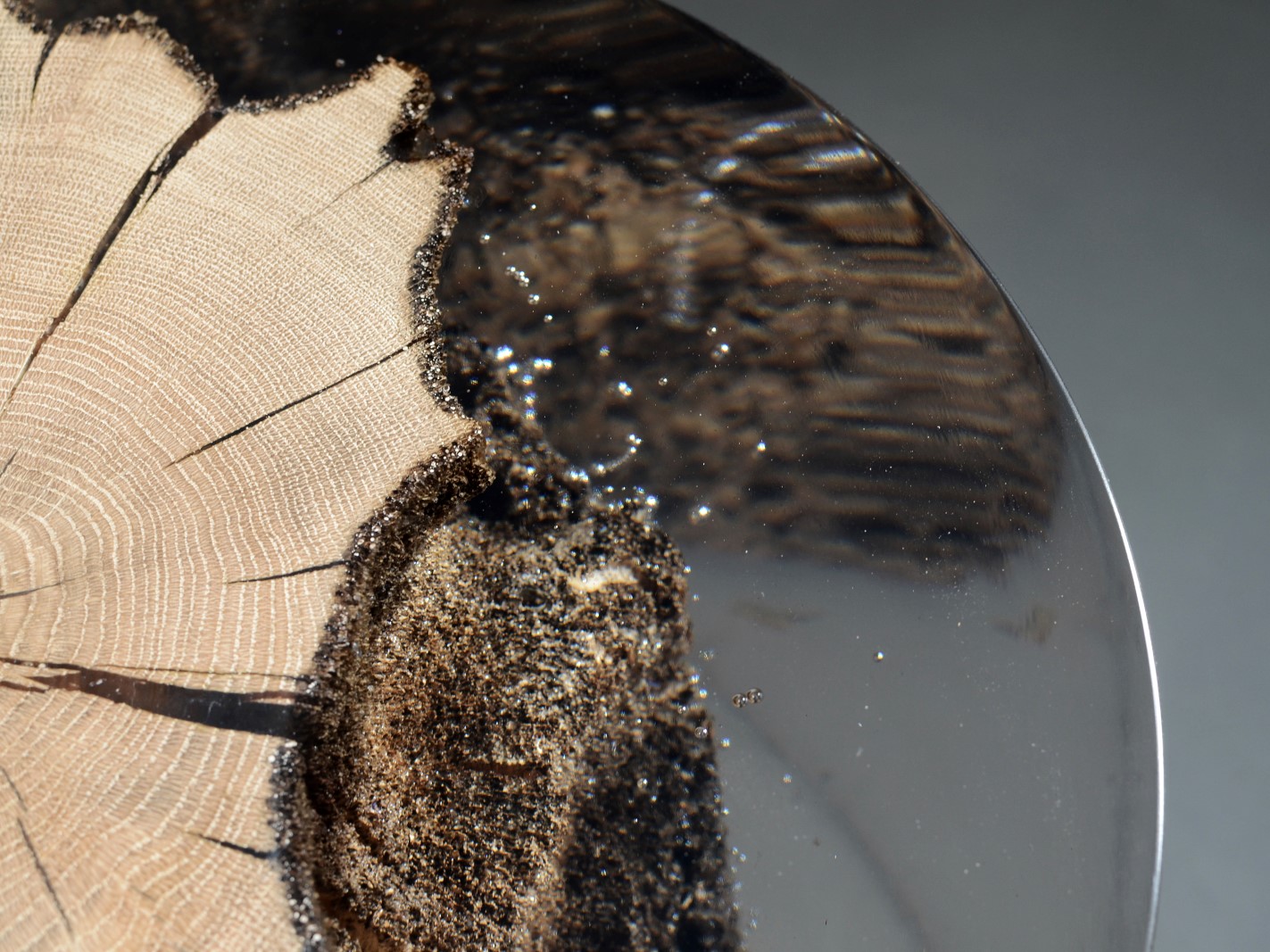 Surfacing FishEye is made of bricola wood, obtained from the timber poles that form the foundations of Venice, driven into the lagoon’s caranto layer – a mixture of solid clay and sand situated at great depths. In spite of everything, Venice continues its fight against the muddy ground and ever increasing water levels. Surfacing FishEye, which is sculpted by water, salt, shipworms and time, is a tribute to this epic submarine struggle that has transcended millennia. During their stay in the Laguna, these Oak logs are deeply sculpted by Teredo Navalis, shipworms that leaves traces of their passing on the wooden surface producing striking patterns of circular holes, whilst avoiding the inner core of the log, allowing it to maintain its health and strength. This creates a beautiful contrast between outer decay and inner robustness. The assiduous labour of the elements necessitates the replacement and scrapping of the poles, providing an organic material that has traversed by life.