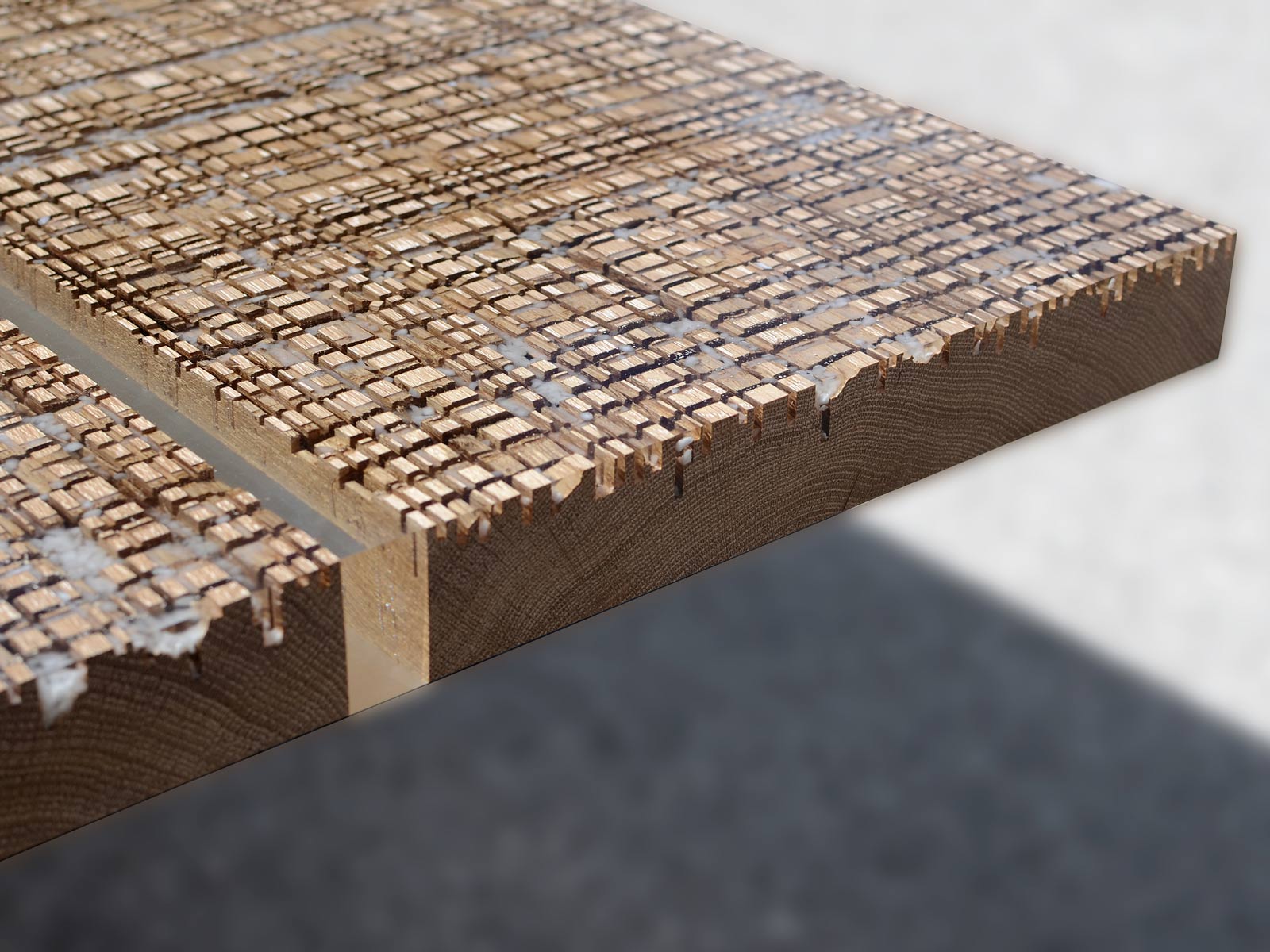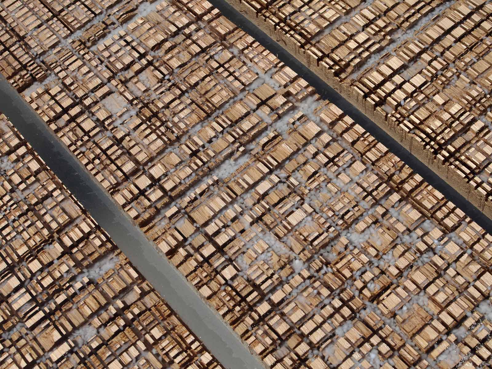 Like the water flow of the cutting operations, a transparent resin is poured on the uneven wood surface to encapsulate marble residues and level all the roughness.