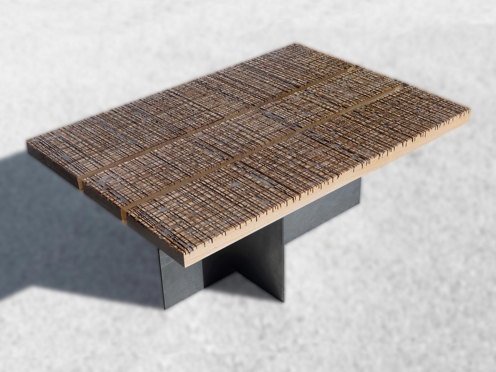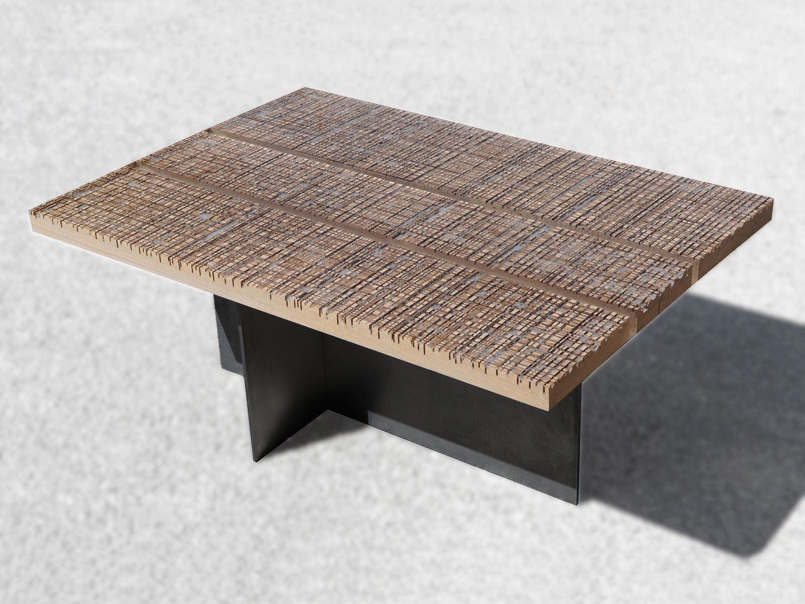 In line with the story of the material used, the metal base of this piece is inspired by the blades used for cutting stones, made of laser cut sheet steel and assembled by simple joints.