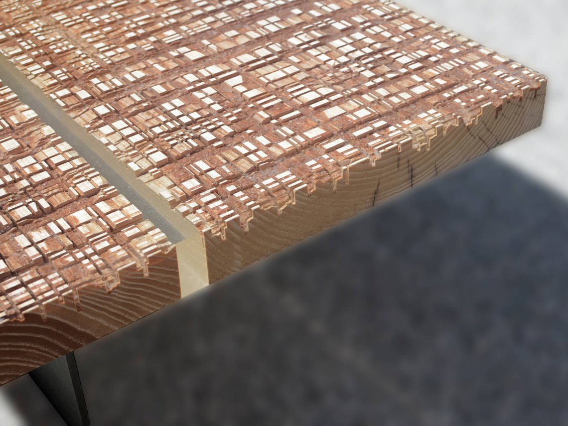 Like the water flow of the cutting operations, a transparent resin is poured on the uneven wood surface to encapsulate marble residues and level all the roughness.