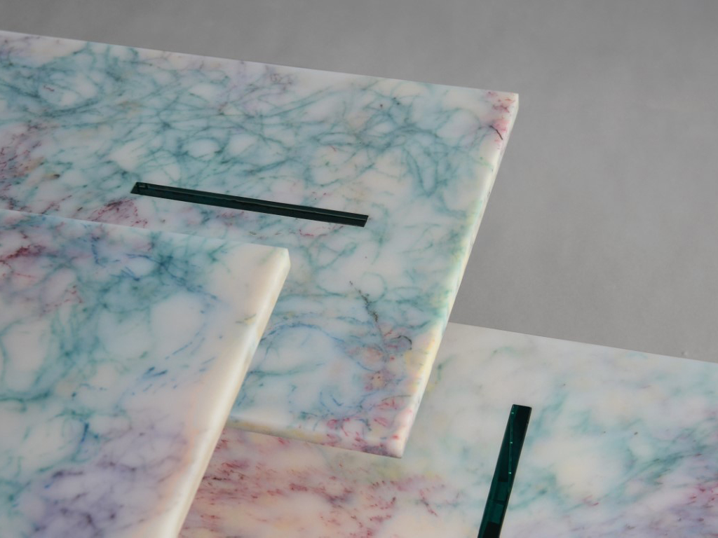 The legs of the tables are made of glass slabs and aluminum fixings – two of the best examples of recyclable materials in the world – simply wedged and screwed in the nylon tabletops, so each part can be easily removed in order to make the prototypes 100% recyclable in the future.