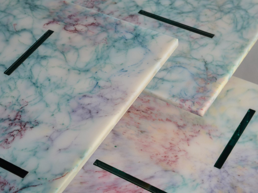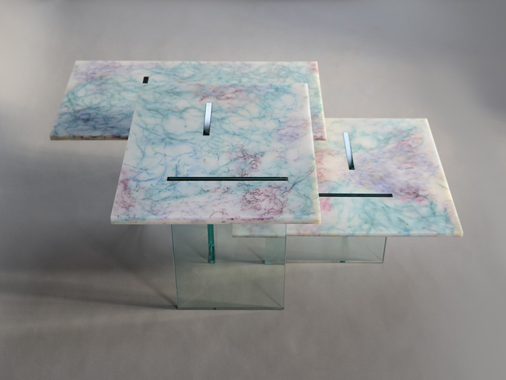 The tabletops are multicolored since we melted together nets of various colors, dramatically tangled as in the seabed, with a surprising marbled effect.
