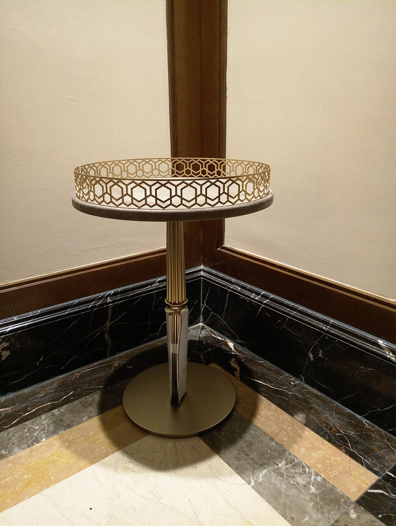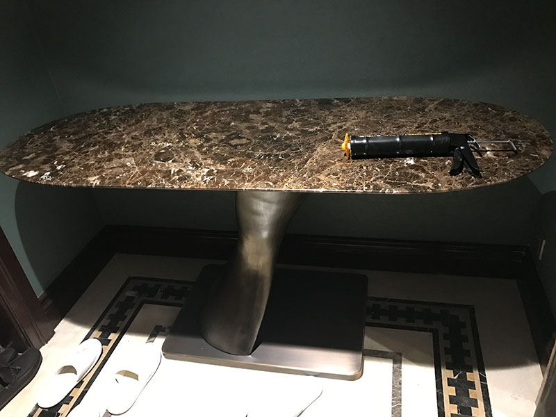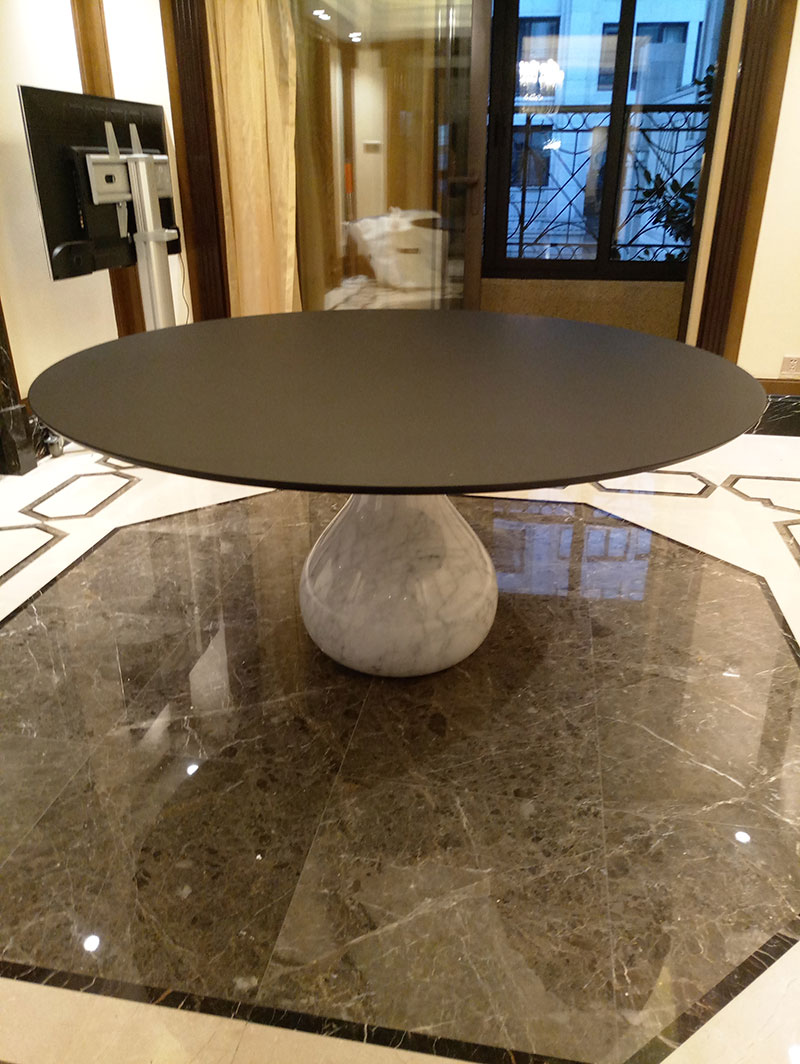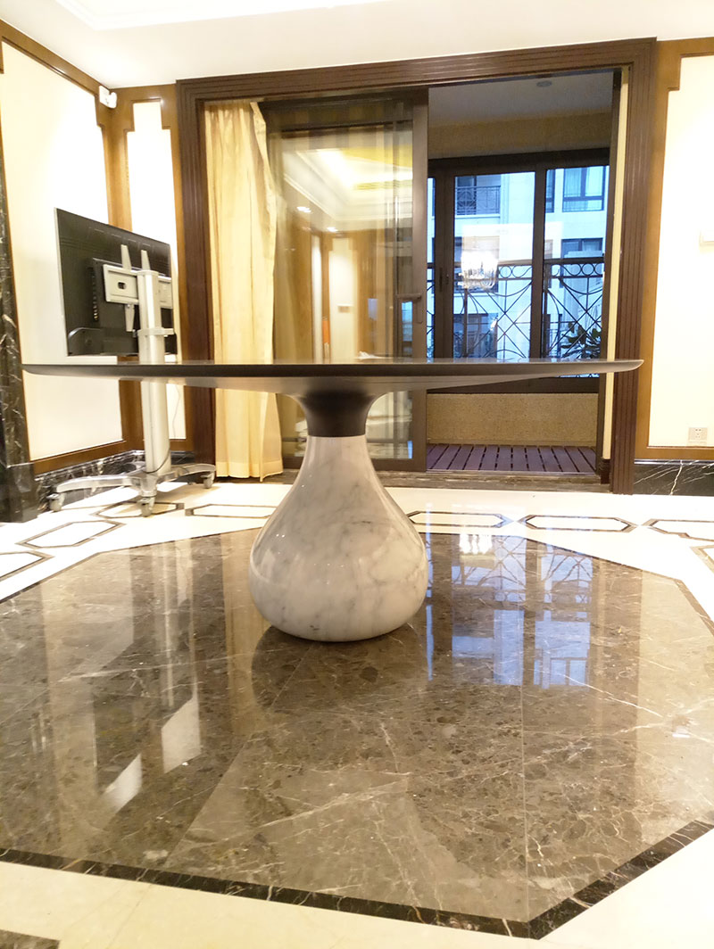 大理石桌底與桌面之間僅用一根金屬棒連接,