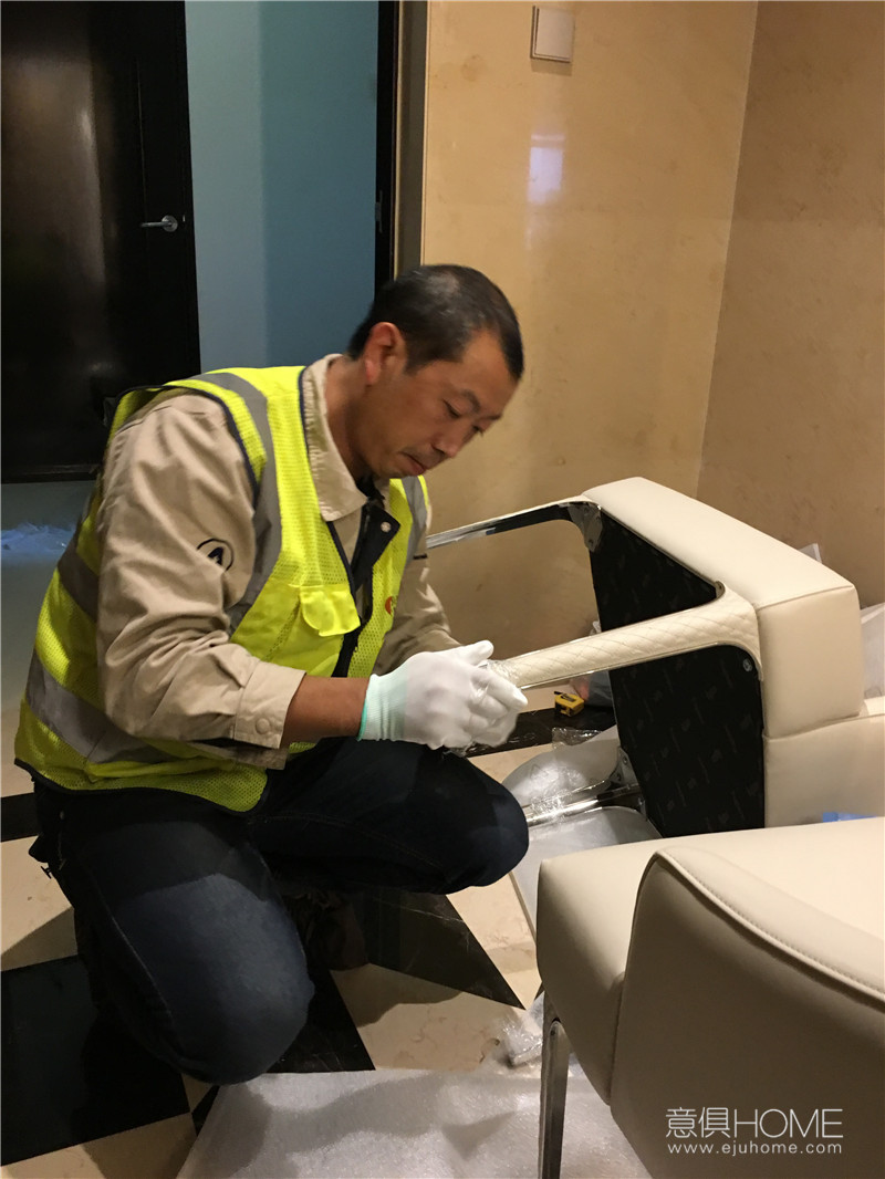 意俱安裝師傅正在組裝RUGIANO Arianna扶手椅,這款椅子,摒棄了不必要的奢華,