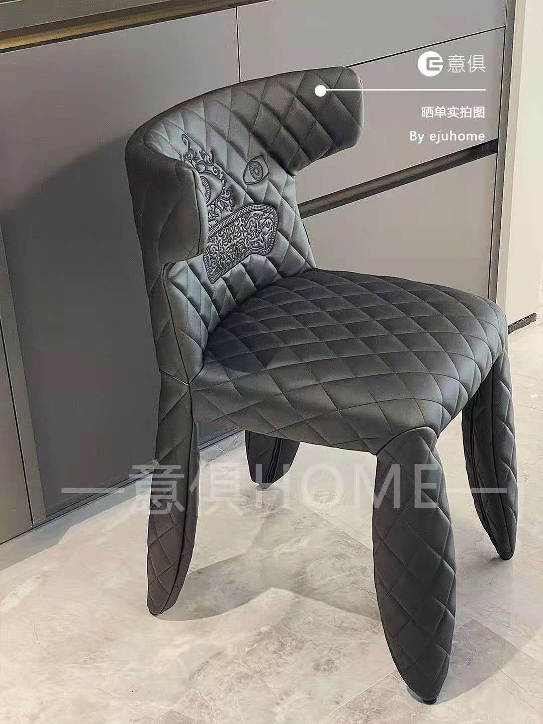 餐椅有兩把,一個是主位上的黑色餐椅,是荷蘭家具品牌moooi的Monster (怪物)餐椅,整張座椅就連椅腳都使用細致柔韌的皮革包裹,沒有任何的銳角。經典 Coco Chanel 般的黑色菱格紋加強了蓬松、舒適的質感,不論是搭配圓桌、長桌或是餐桌都很合適,靠背微微內收的設計給人極大的安全感.