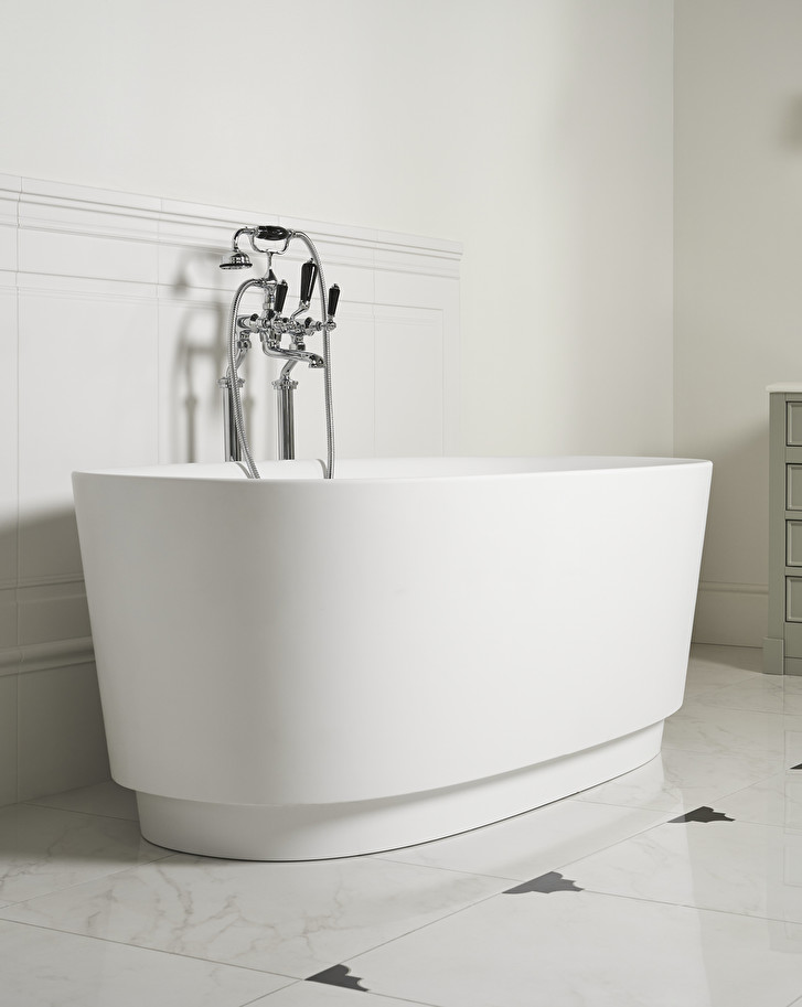Drain with cover in White Tec Plus and siphoned trap assembly included. The plinth does not have a protective finish.