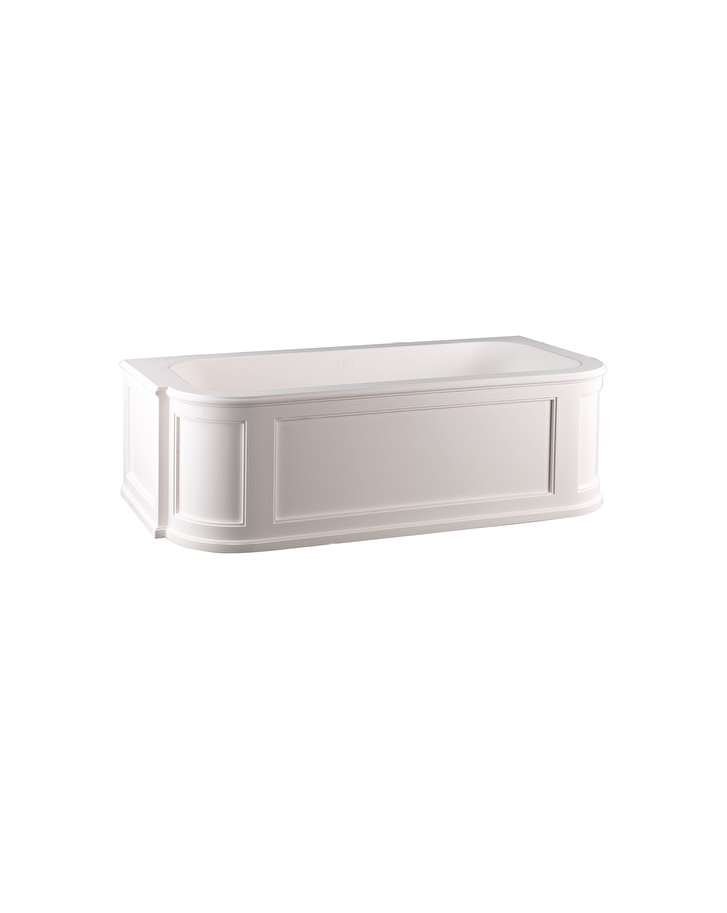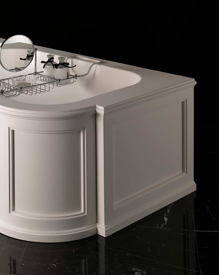 An impressive single-block bathtub in the neo-classic style with an explicitly prestigious character. Its sculptural elegance is emphasized by the rigorous geometrical designs of bas-reliefs. It is also available in a right or left corner version and can be enriched with precious decorative elements in white Carrara or black Marquina marble. The bathtub body is in White Tec, an innovative composite that guarantees excellent impact or mark strength and compliance with the highest standards in terms of quality and sustainability.