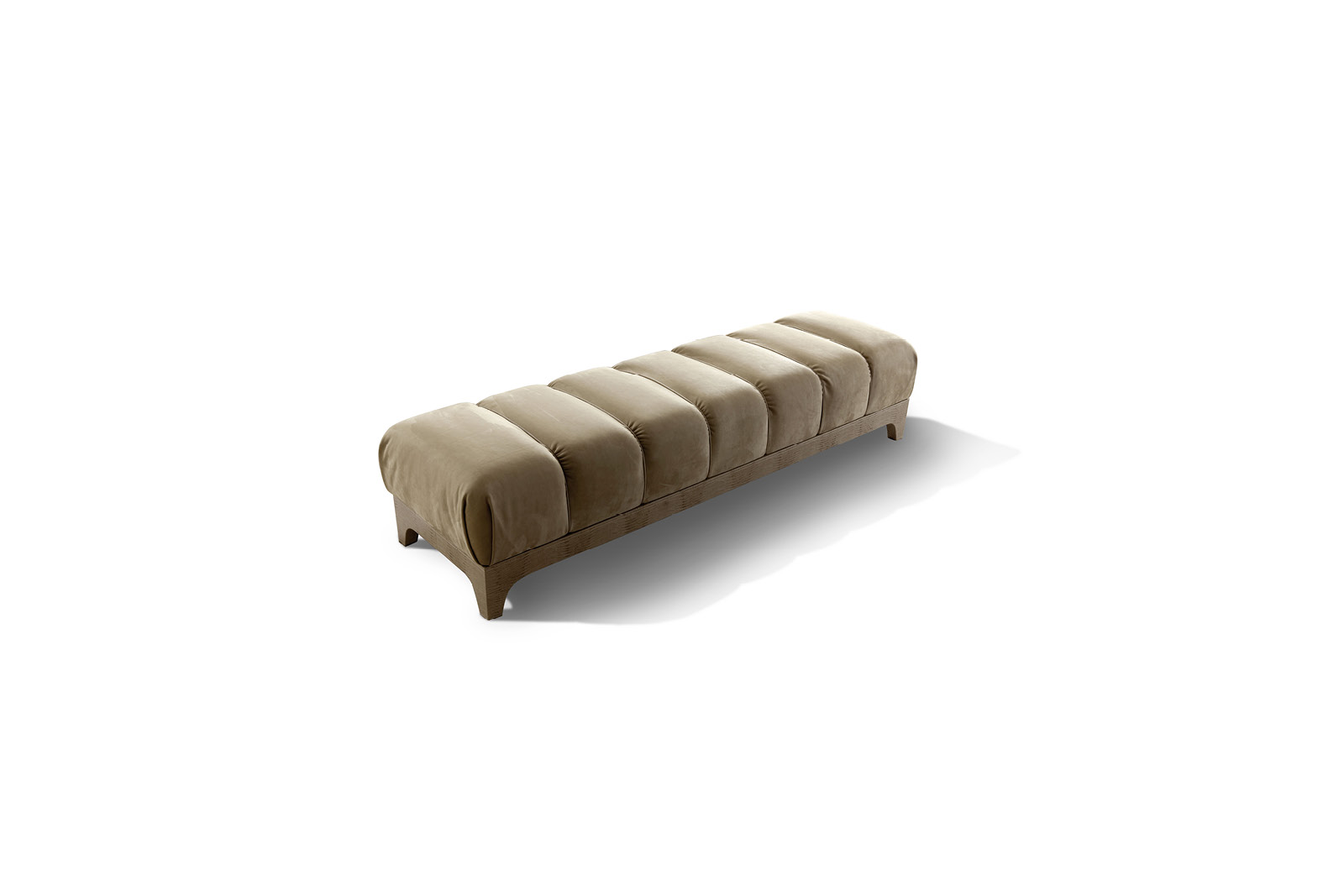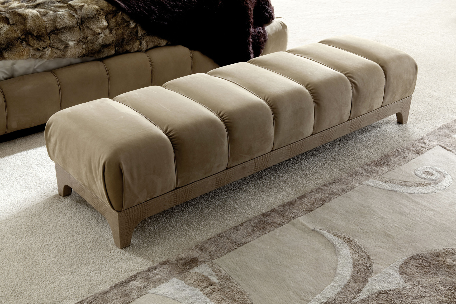 Upholstered bench available in first grade leather, nubuk leather, lizard printed leather, velvet or suede fabric.
