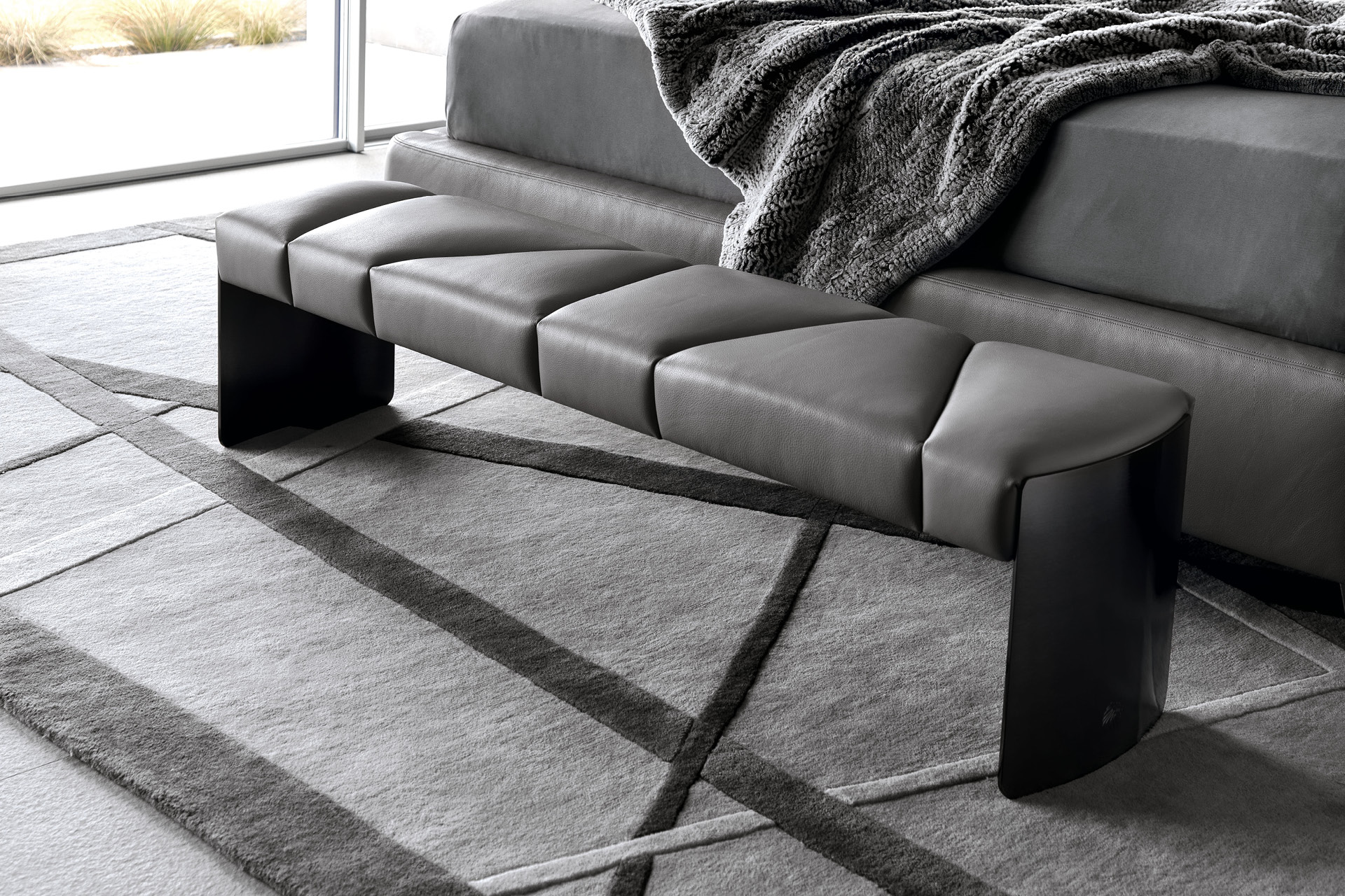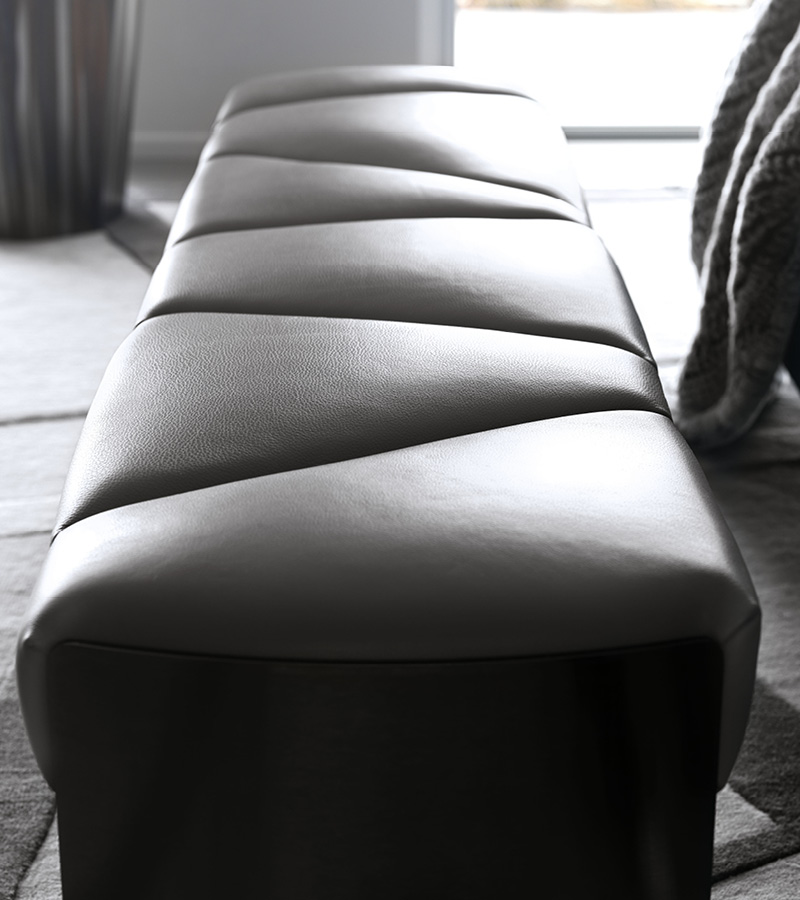 Bench available in first grade leather, nubuk leather, lizard printed leather, velvet or suede fabric. Curved legs in satin black nickel stainless steel with lasered Giorgio Collection logo.