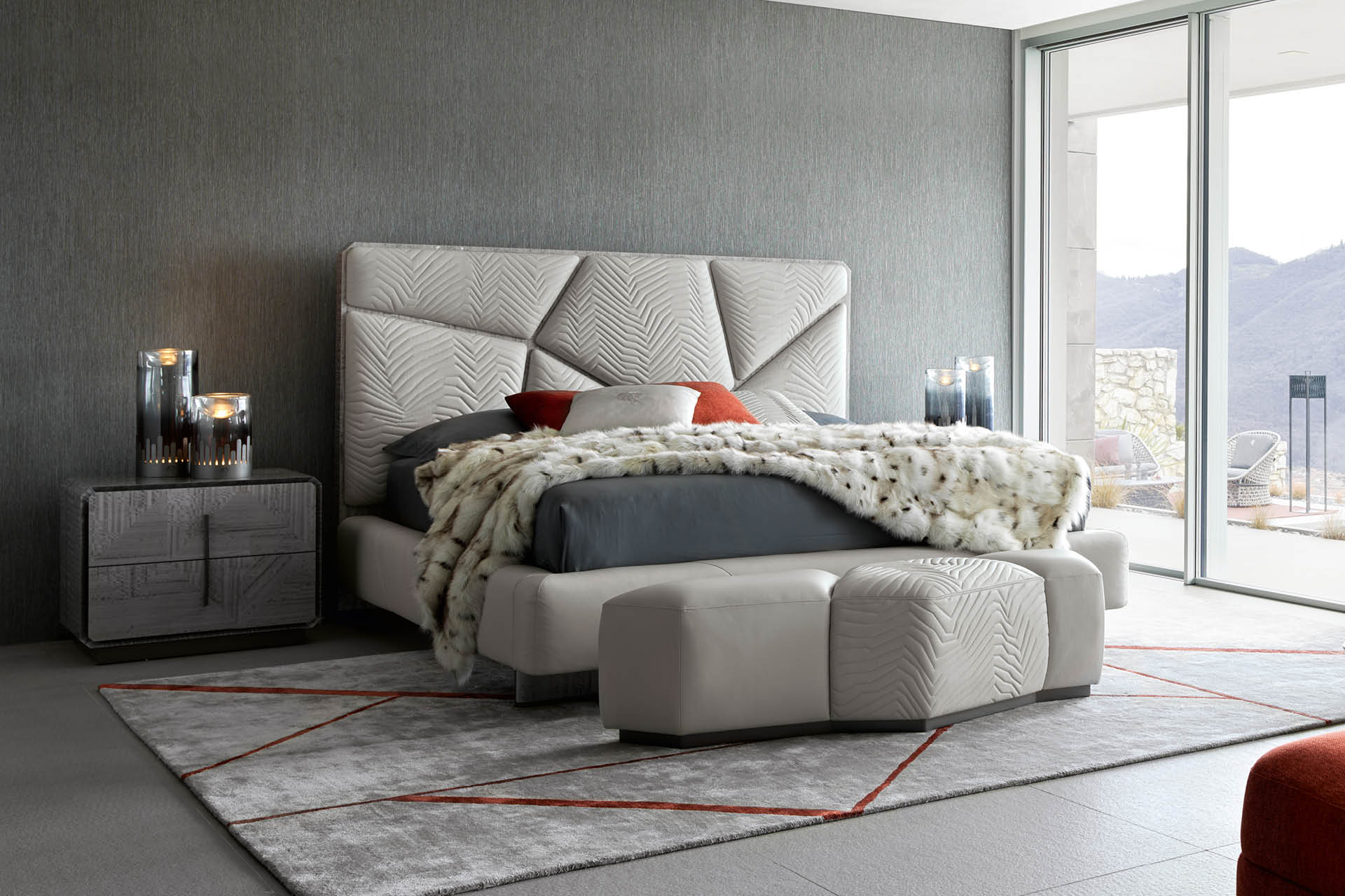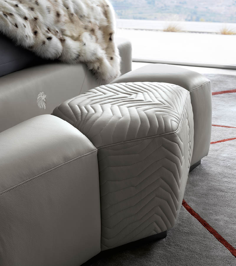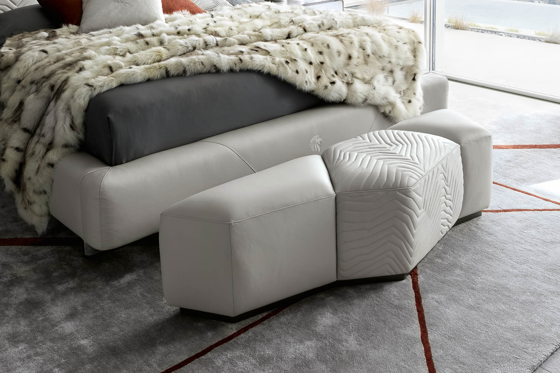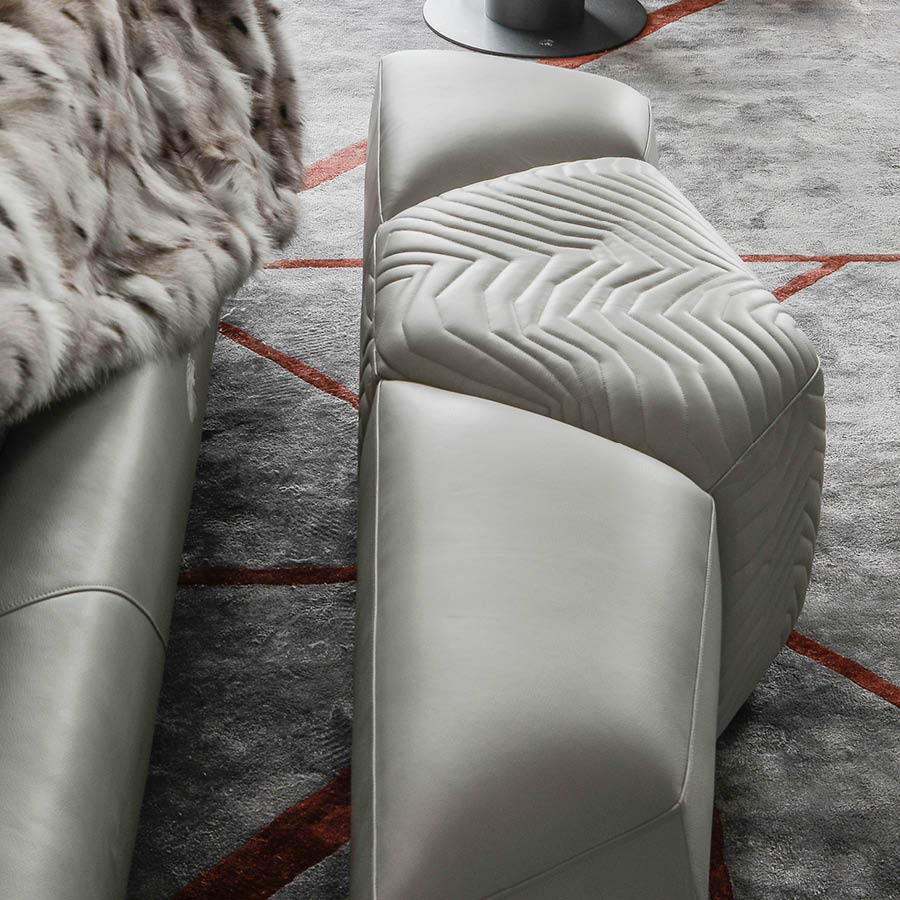Bench available in first grade leather, nubuk leather, lizard printed leather, velvet or suede fabric with quilted central part. Base in black satin lacquered wood.