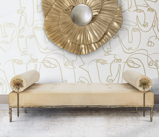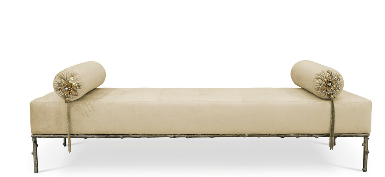 Not exactly flirtatious, but certainly not sweet, the Privê II Day Bed guarantees sensuous drama. Exquisite fora inspired details adorn this seductive piece. A delicate branch-like base, stunning bronze & crystal jeweled bolsters, and sumptuous soft tufting make this an utterly desirable piece.