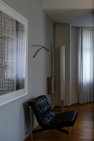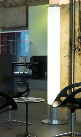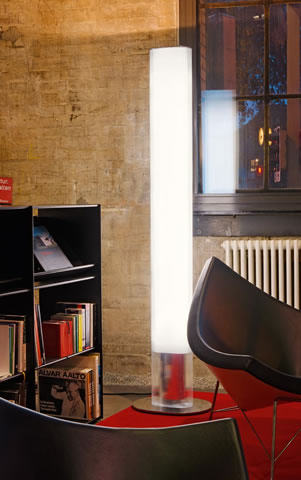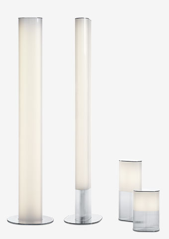 The indirect illumination of the standing light and the energy-saving lamp in the light body can be dimmed or switched on or off independently to create totally different light scenarios from powerful illumination to soft mood lighting. The light body itself shines a powerful but glare-free light through the opal film. The lower, semi-transparent part of the column imparts a floating and lightness of form to the light. The two smaller lamps at different heights can be used both as a table and as a floor light.