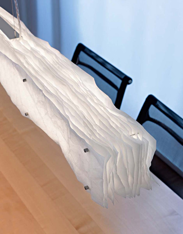 With belux one by one Steve Lechot has created a fascinating play of light and shadow. The layers consist of polyester fleece which, as a result of a number of finishing processes, is practically tearproof, age-resistant and flame retardant.The entire belux one by one family of lights is handmade in a sheltered workshop for the disabled who apply the necessary concentration and patience required to crush and layer the paper as well as insert the spacers. belux one by one shows that energy saving need not be at the expense of emotion: the powerful LED light offers both emotional satisfaction in its dimmed state as well as providing powerful ambient lighting. The standard and pendant lights can be dimmed directly on the lamp.