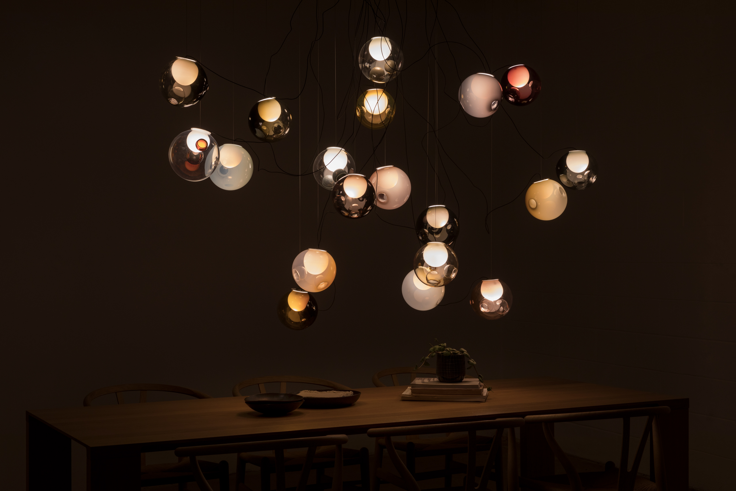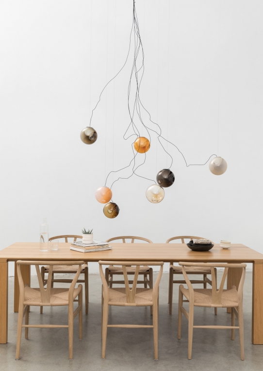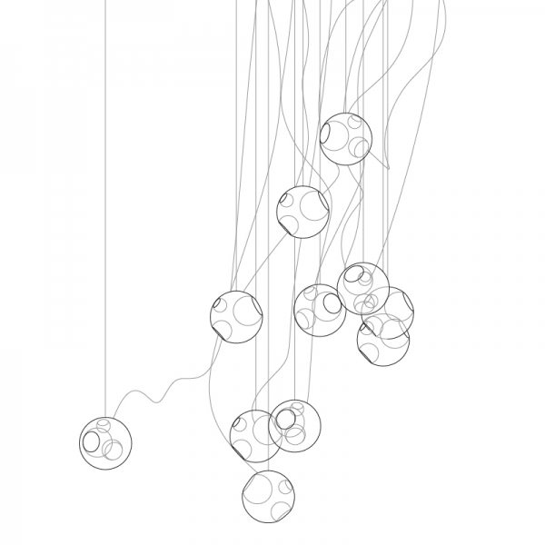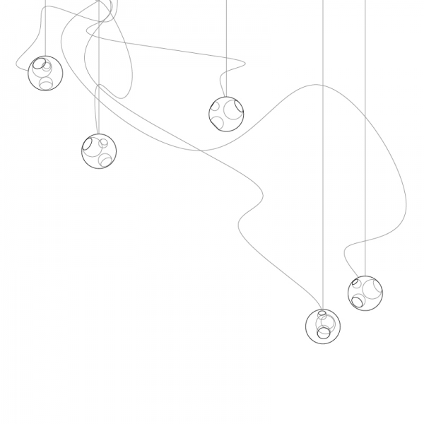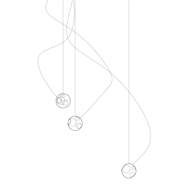 The 28 semi-rigid is a flexible suspension system enables pendants to be nestled in close-knit groups or loosely composed in a wider field, allowing each piece to be perceived individually.