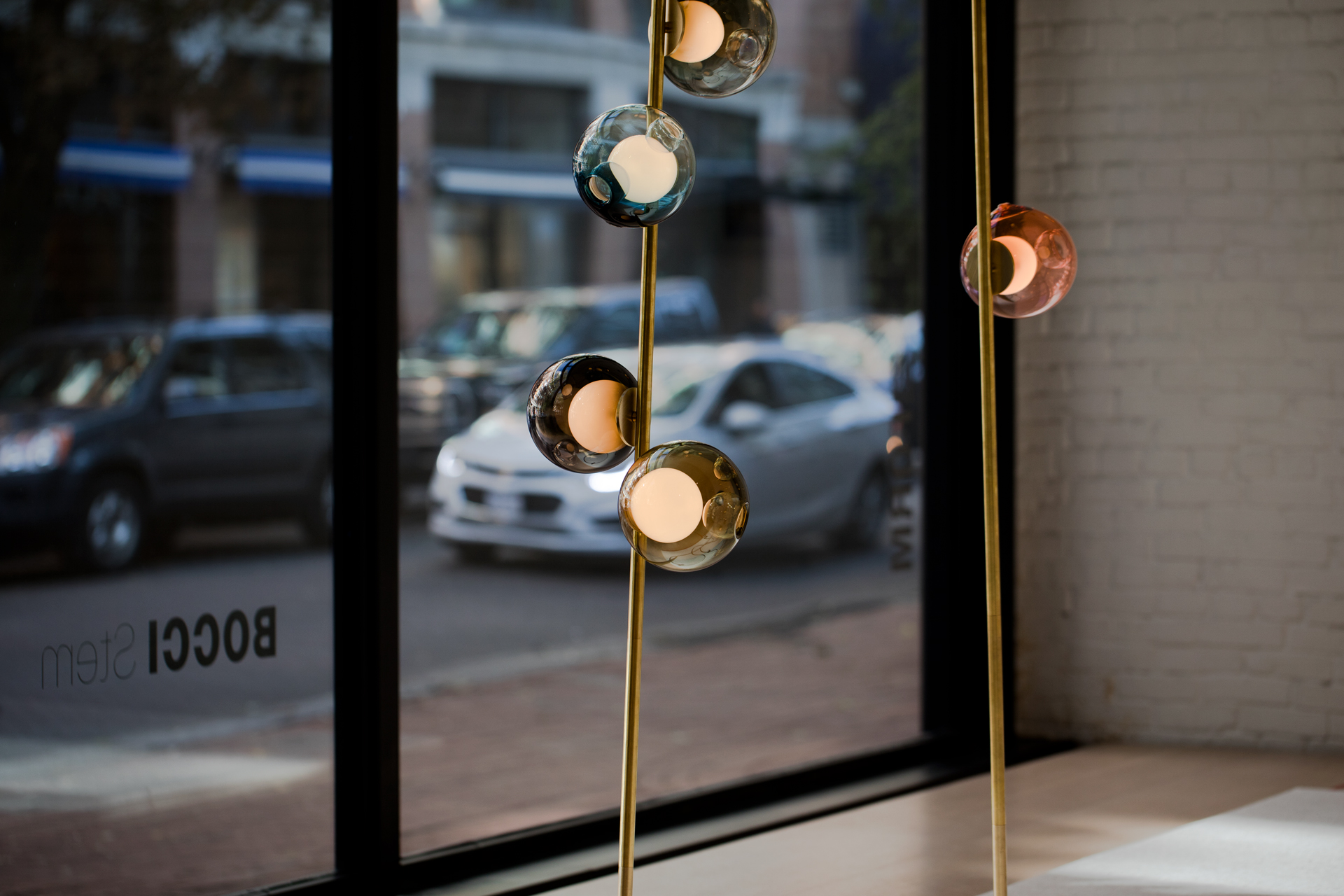 The 28 series stem column system comes in a brass or black finish, two different configurations and multiple height options. The spring loaded spike system allows for both vertical and angled installation. The semi-rigid black fabric cord includes a patented integral 360 degree dimming system housed within a sleek brass cylinder.