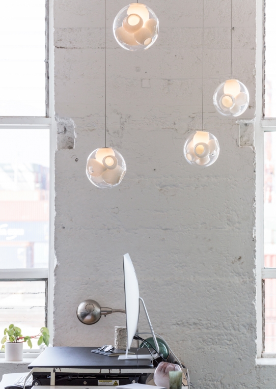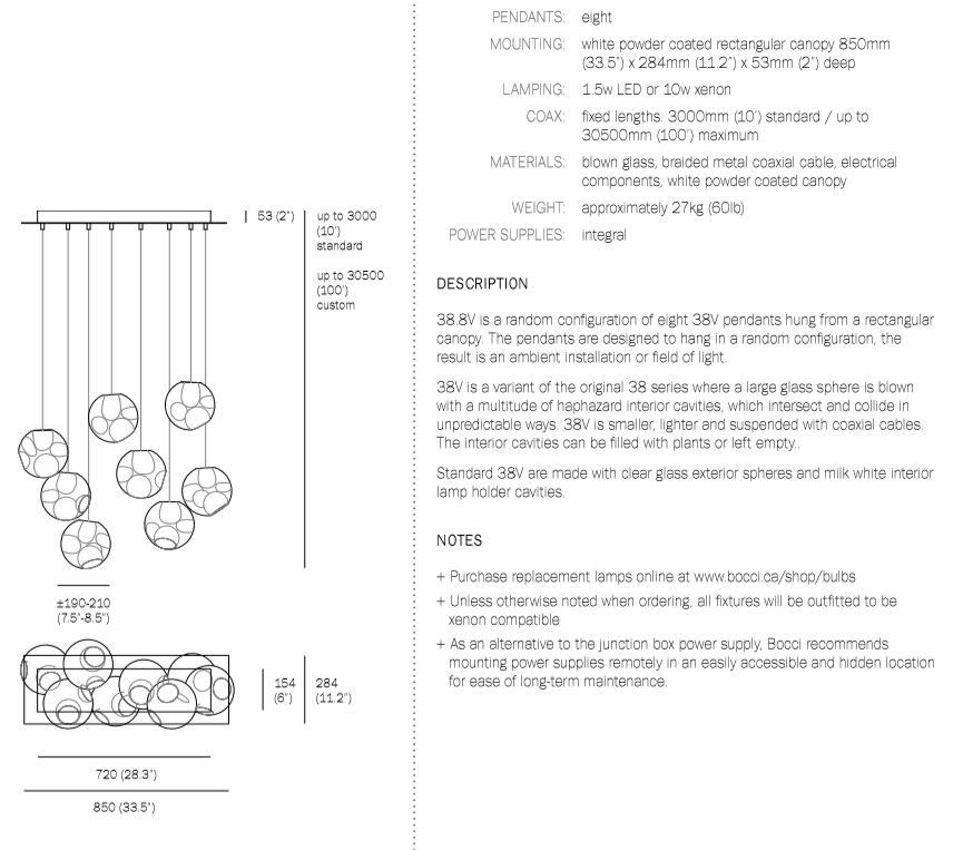 38V is a variant of the original 38 series where a large glass sphere is blown with a multitude of haphazard interior cavities, which intersect and collide in unpredictable ways. 38V is smaller, lighter and suspended with coaxial cables. The interior cavities can be filled with plants or left empty.