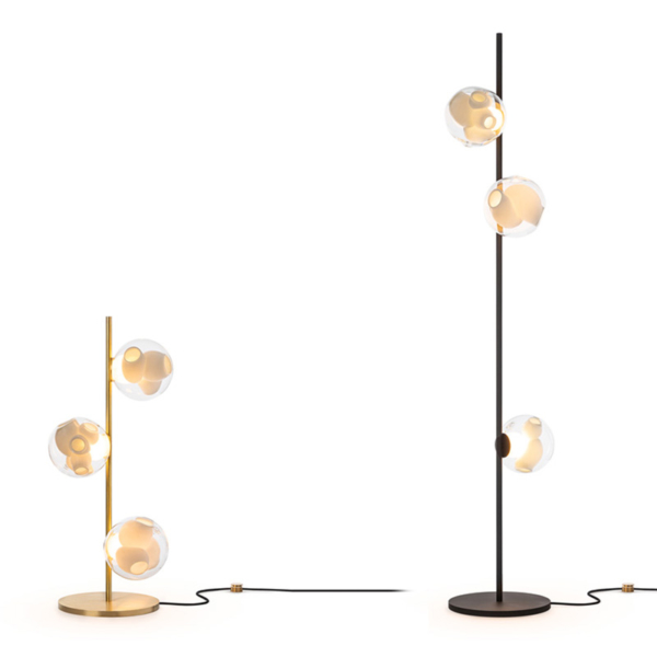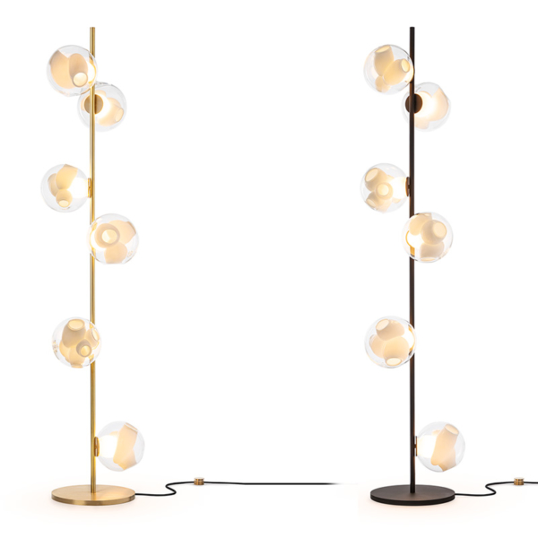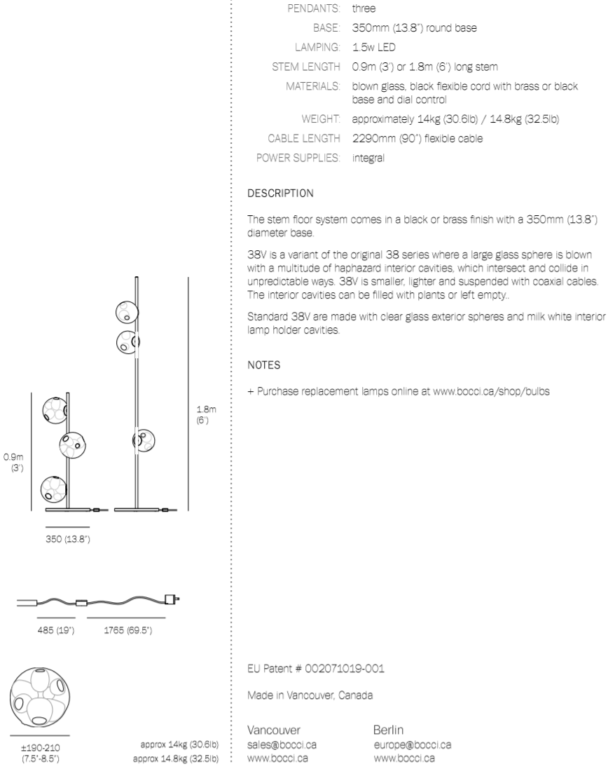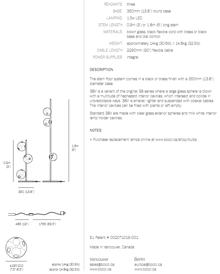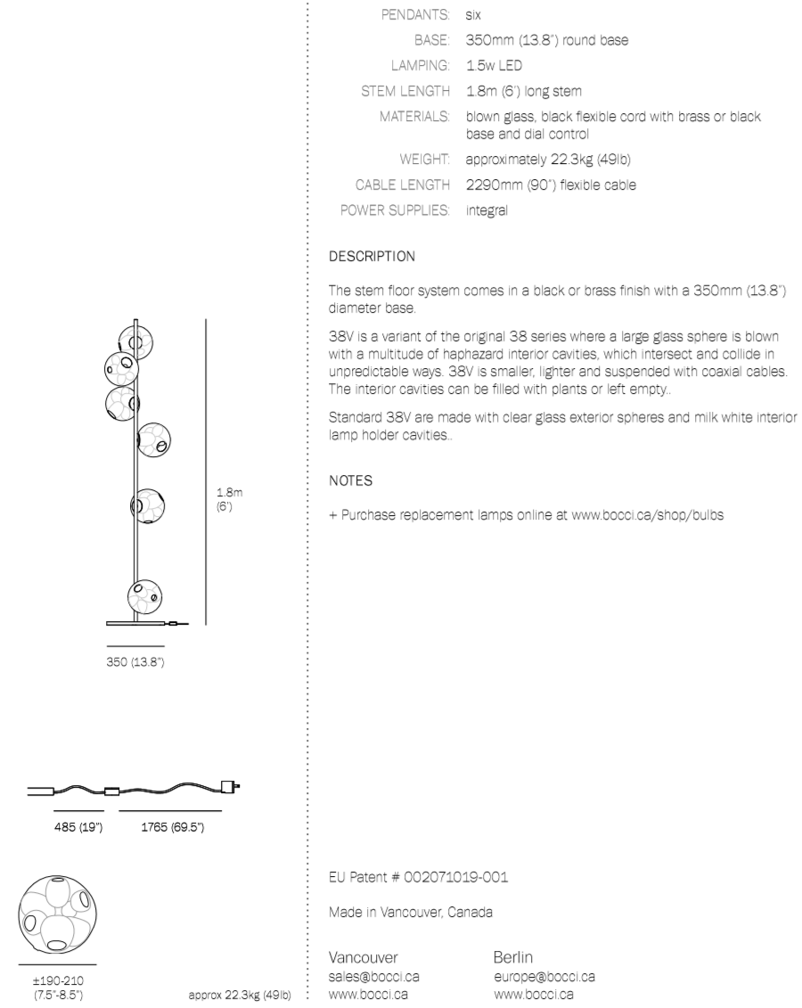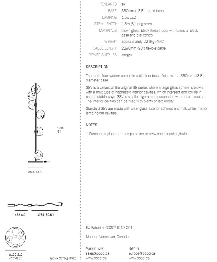 The 38V series stem floor system comes in a brass or black finish and three different configurations. The semi-rigid black fabric cord includes a patented integral 360 degree dimming system housed within a sleek brass cylinder.