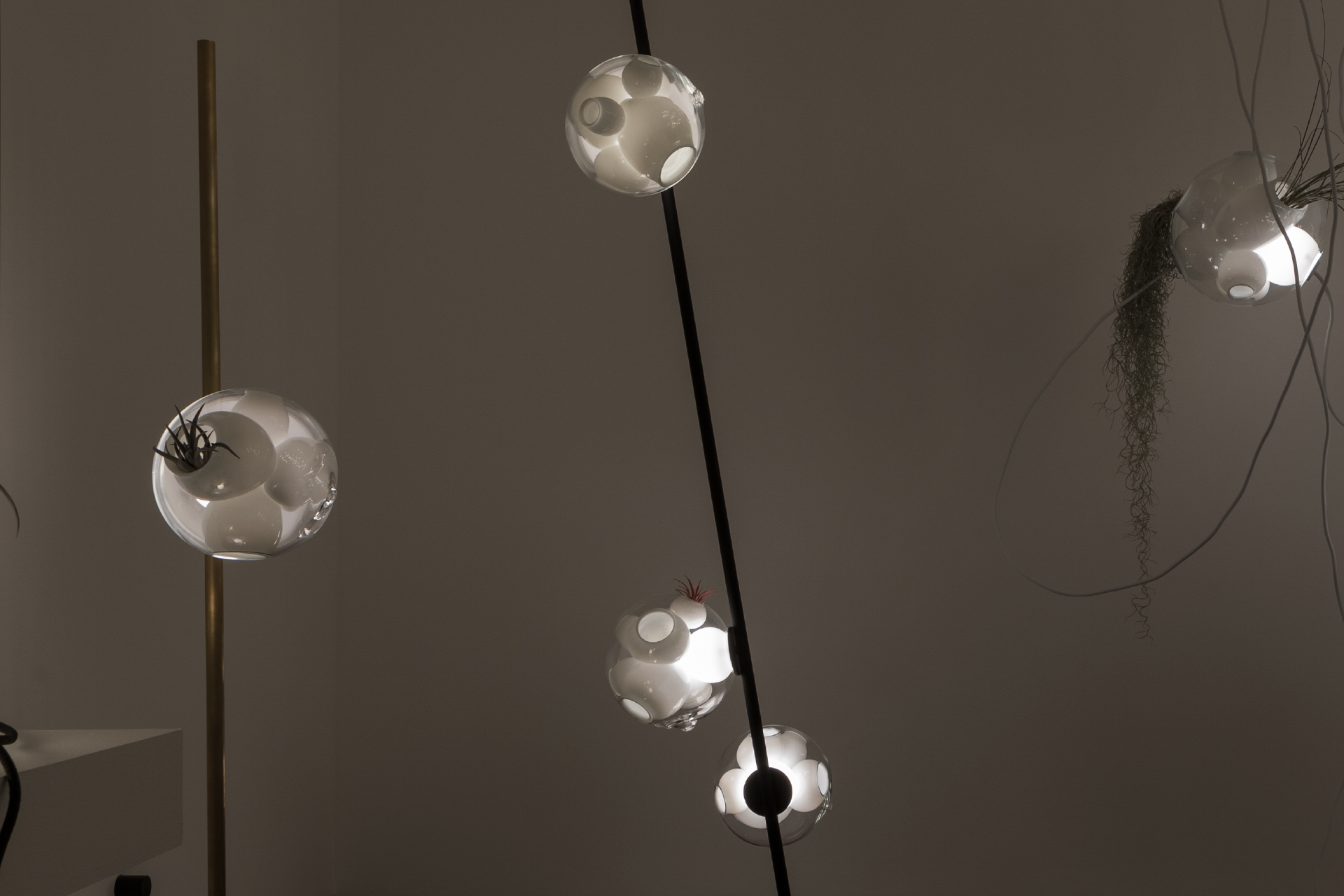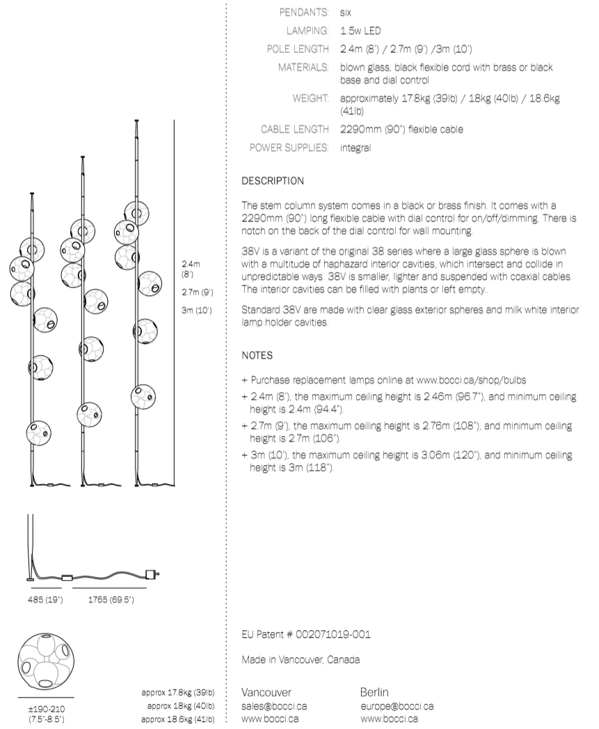 The 38V series stem column system comes in a brass or black finish, two different configurations and multiple height options. The spring loaded spike system allows for both vertical and angled installation. The semi-rigid black fabric cord includes a patented integral 360 degree dimming system housed within a sleek brass cylinder.