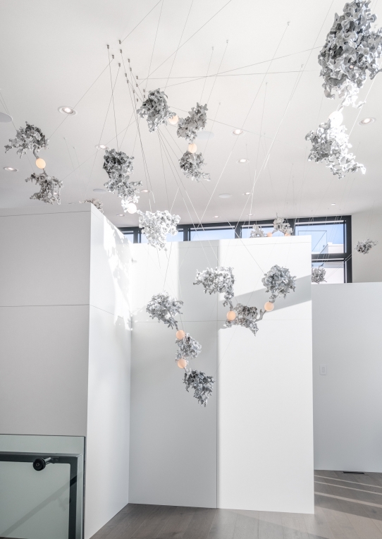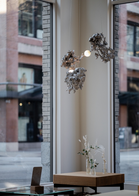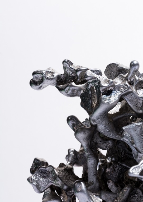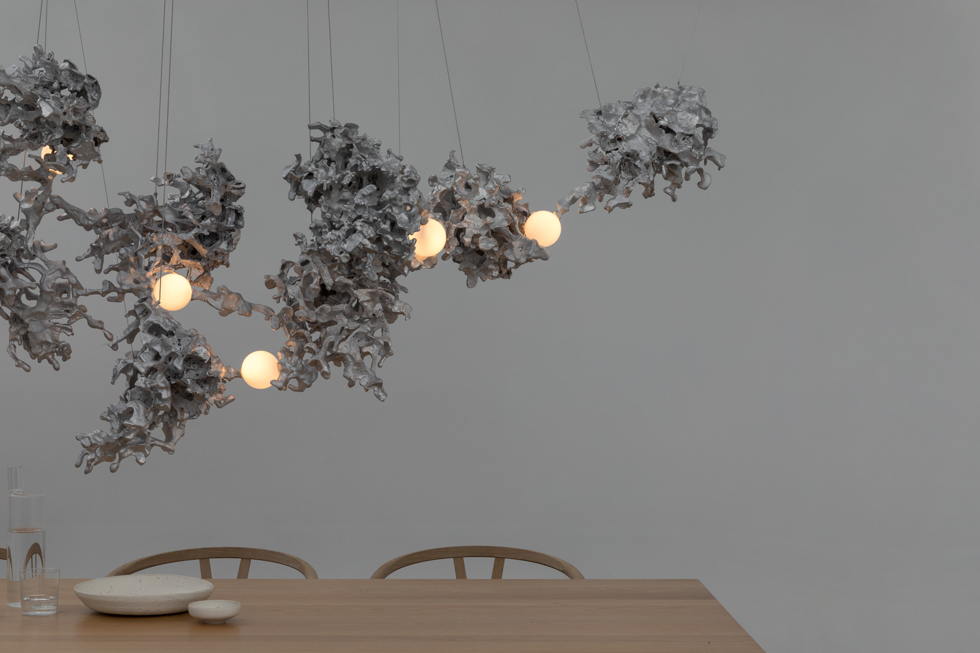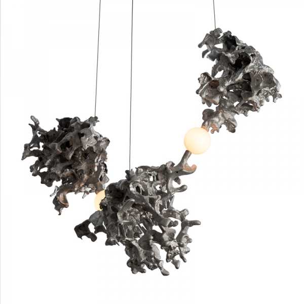 Each 44 results from a free pour of molten aluminium into a large canister filled with rock-like modules of resin-impregnated sand, a waste product of conventional sand casting. Low voltage electricity is transmitted through the castings, allowing a light source to be suspended between them without using cables.