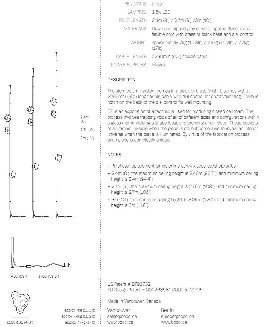 The 57 series stem column system comes in a brass or black finish, two different configurations and multiple height options. The spring loaded spike system allows for both vertical and angled installation. The semi-rigid black fabric cord includes a patented integral 360 degree dimming system housed within a sleek brass cylinder.
