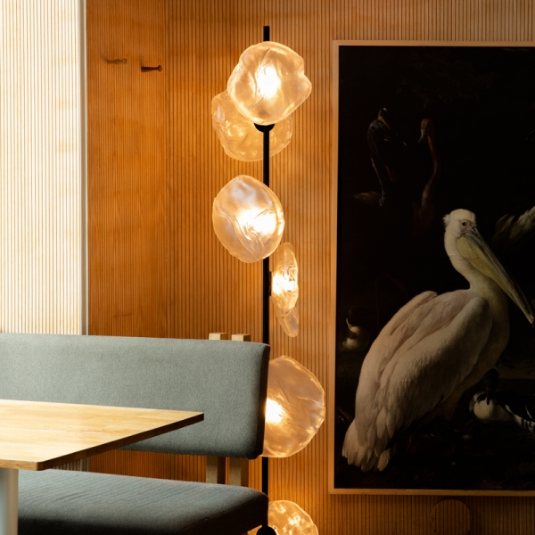 The 73 series stem column system comes in a brass or black finish, two different configurations and multiple height options. The spring loaded spike system allows for both vertical and angled installation. The semi-rigid black fabric cord includes a patented integral 360 degree dimming system housed within a sleek brass cylinder.