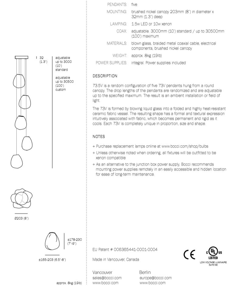 73.5V is a low voltage arrangement of 5 blown-glass pendants. Each pendant is hand blown into a folded and highly heat-resistant ceramic fabric vessel. Each pendant is housed with a 10 watt xenon or 1.5 watt LED lamp.