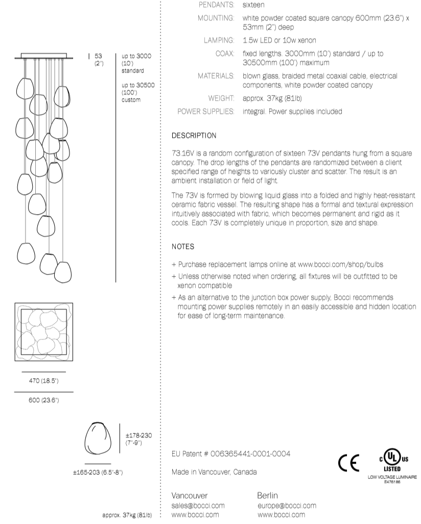 73.16V is a low voltage arrangement of 16 blown-glass pendants. Each pendant is hand blown into a folded and highly heat-resistant ceramic fabric vessel. Each pendant is housed with a 10 watt xenon or 1.5 watt LED lamp.