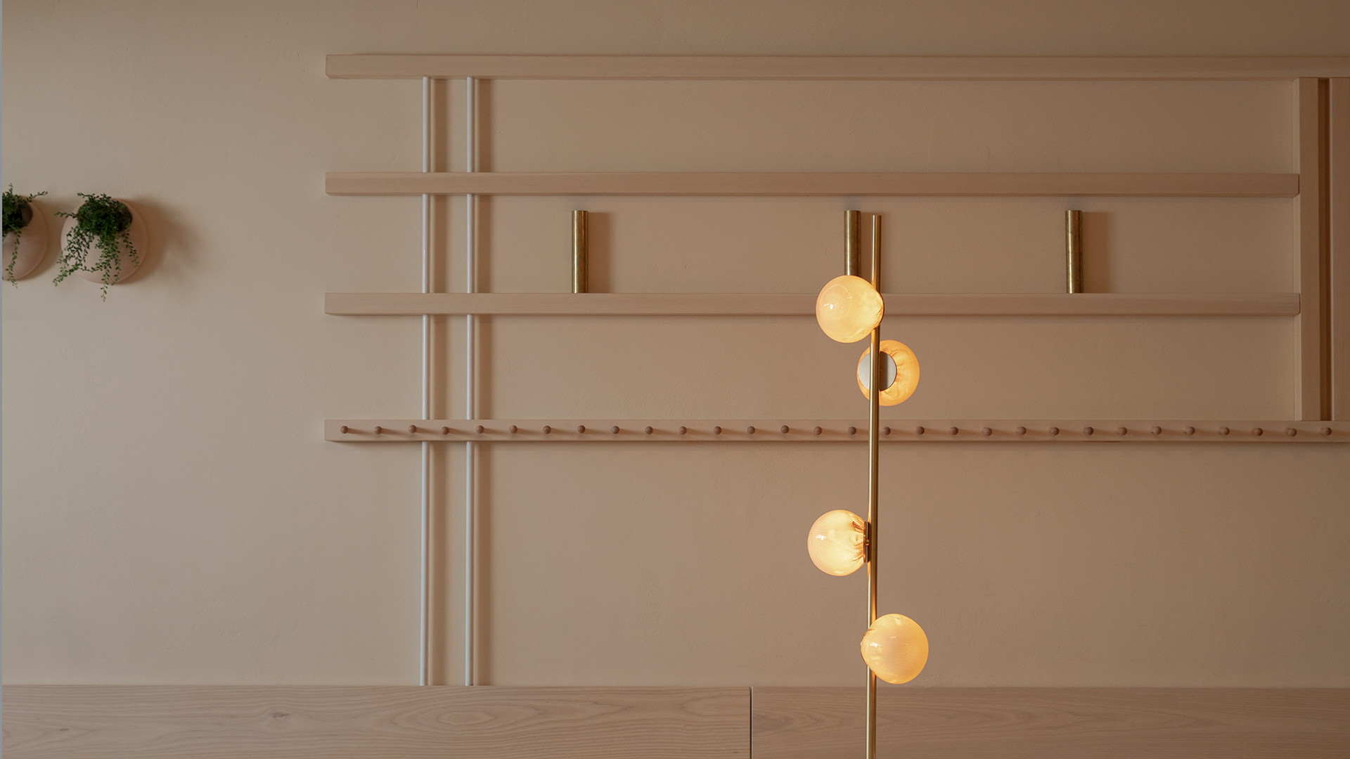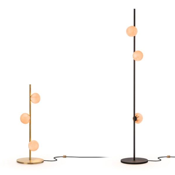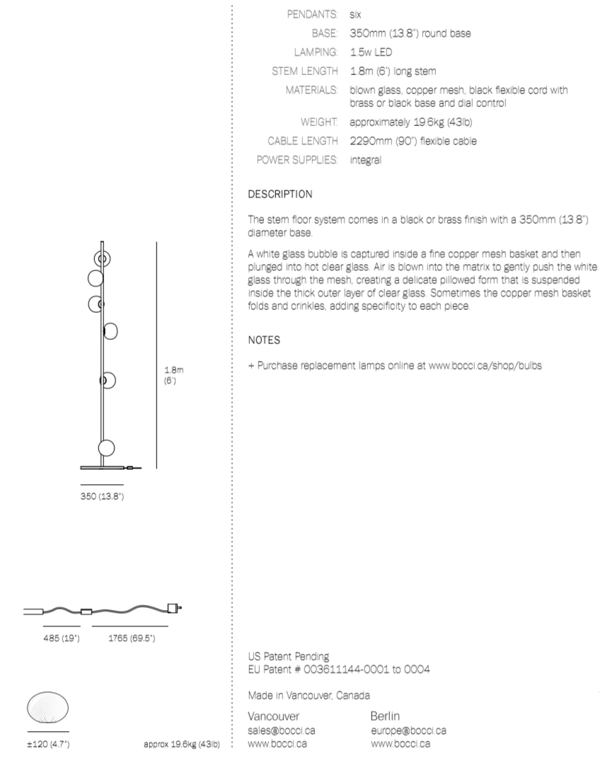 The 84 series stem floor system comes in a brass or black finish and three different configurations. The semi-rigid black fabric cord includes a patented integral 360 degree dimming system housed within a sleek brass cylinder.