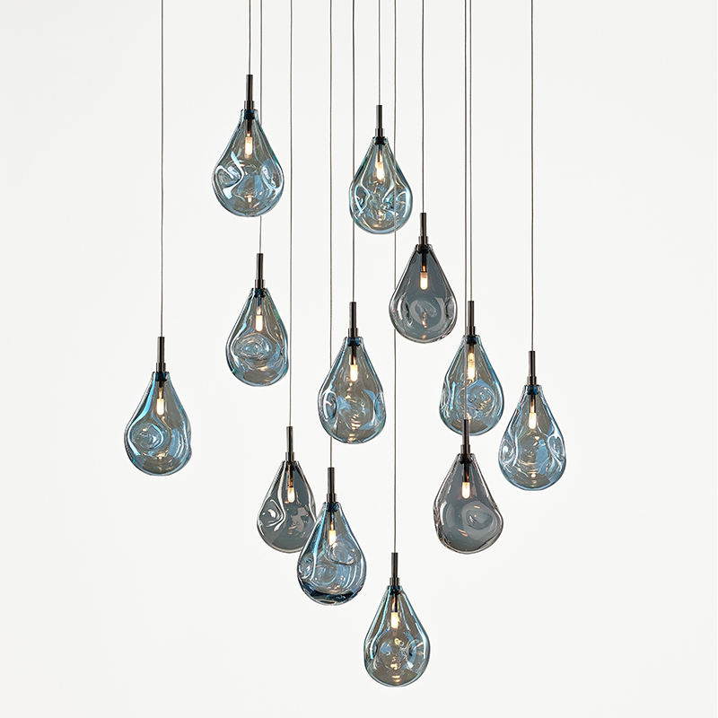 Varied colors, transparency and continuously changing shapes – the characteristic features of soap bubbles-- inspired this BOMMA collection. When lighted, the metallic sheen of its surface transforms to iridescent and translucent, exposing its crystal character. The entire collection is produced using the technique of hand-blowing without a form. The seemingly perfect droplet of molten glass is given a unique shape as well as a unique color spectrum. The Soap Mini collection allows unlimited space for your creativity, with the option to create as large groups of crystal drops as you fancy – from smaller compositions to expansive light constellations.