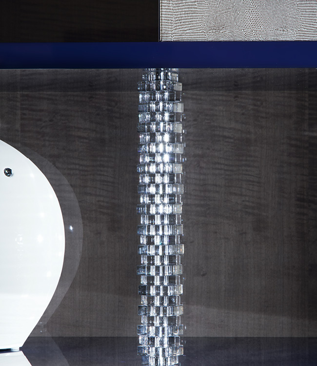 2 sections modular Bookcase in combination of tiger African sycomore veneer with high gloss polyester finish and 4 doors in silver lizard printed leather with inside in cobalt blue high gloss polyester finish. Florentine crystal inserted with led light touching system.