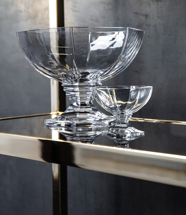 Bifacial showcase in light gold chrome stainless steel frame. 9 tempered fixed smoked glass shelves.
