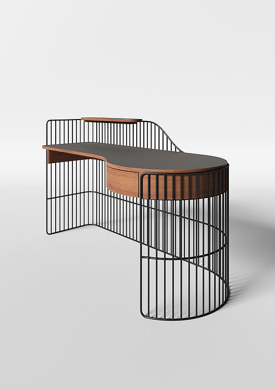 Der asymmetrische Schreibtisch der PARADISE BIRD Kollektion von Luca Nichetto l?dt mit seinen gewundenen Kurven und eleganten Linien zur Interaktion ein. Der ikonische Arbeitsplatz mit Fronten aus schwarz gebeizter Esche oder Nuss natur, einer edlen matt beschichteten schwarzen Oberfl?che, zweistufig mit einem Regal zur Organisation und Aufbewahrung, wird von der für die Kollektion typischen und an eine Voliére erinnernden, feinen Metallstruktur getragen. Nahtlos in die Seitenwangen integriert sich eine leichtg?ngige Schublade, welche die meisterhafte Handwerkskunst im wahrsten Sinne und perfekter Form abrundet.