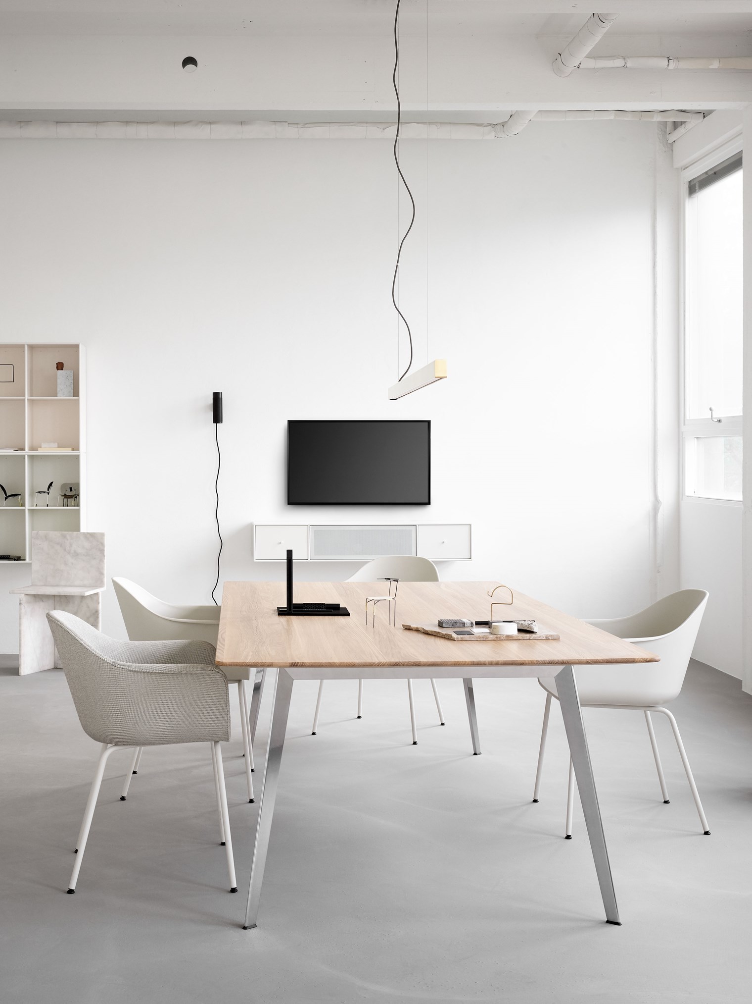 桌子視覺上顯得輕盈干凈,結(jié)構(gòu)堅固穩(wěn)定。桌腿略微向外傾斜,以提供不受限制的腿部空間,并且框架隱藏在桌面下方。該系列有多種尺寸可供選擇,可靈活適應(yīng)任何家庭和辦公環(huán)境。該桌子的桌面共有八種不同的材料:雪絲層壓板、黑色和新北歐顏色的油氈、白橡木、燒橡木和黑橡木以及實心道格拉斯橡木和實心橡木貼面。