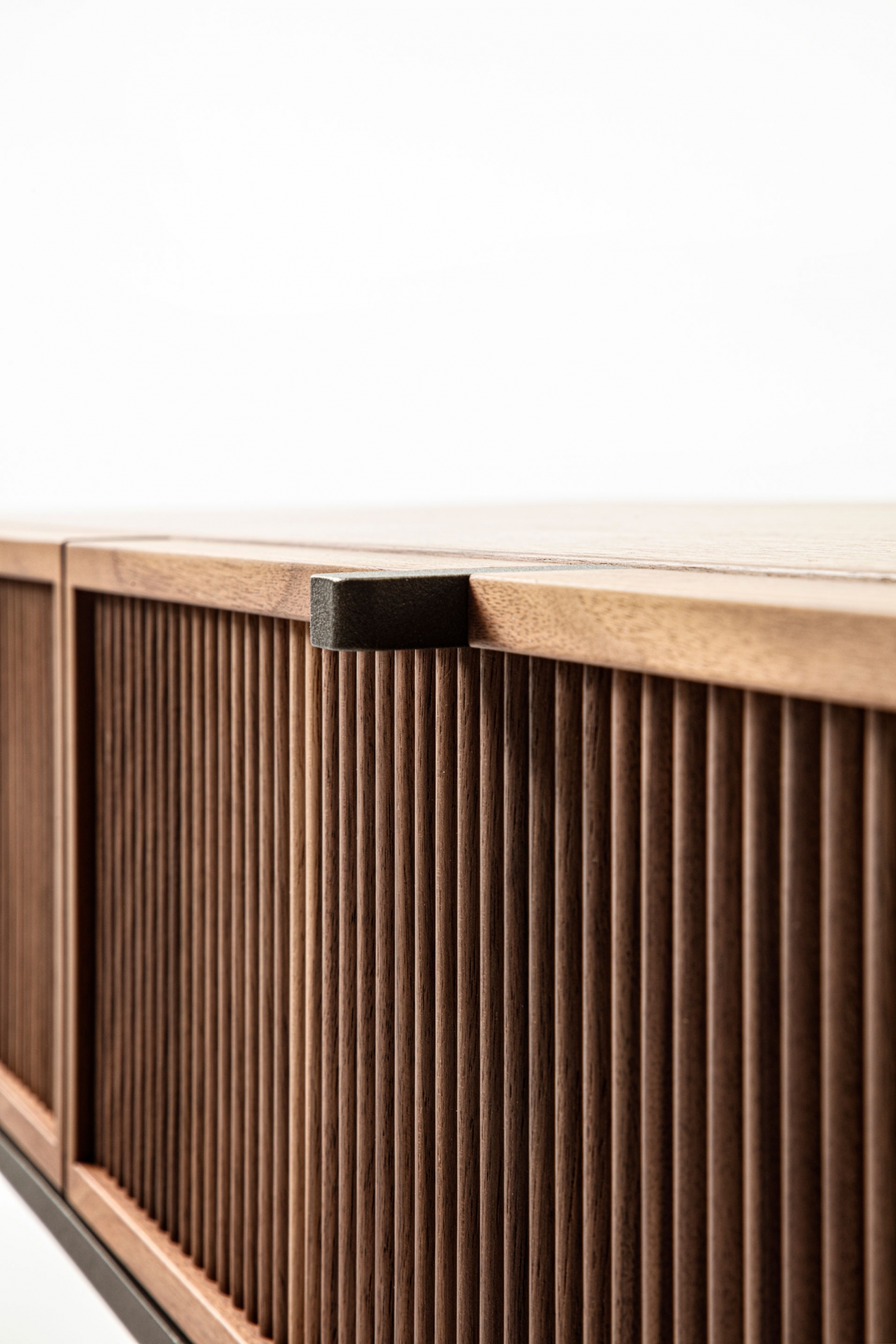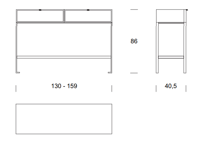 Wood console table with metal base. The top is made of wood, and on the front, it is possible to have two drawers with a canned finish or alternatively two drawers with leather-covered front.