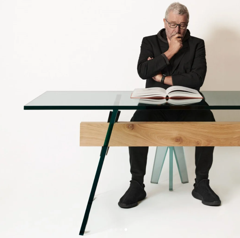 Serie di tavoli da pranzo rettangolari con piano in cristallo trasparente mm 19 e base in cristallo trasparente mm 24 temperato. Una trave, in un unico massello di grosso spessore, passa attraverso i fori - a filo lucido inclinato - dei cristalli della base, unendoli e sostenendoli. Dei cunei in metallo cromato lucido si inseriscono ad incastro nei fori rastremati presenti sulla trave in legno, bloccando saldamente le lastre di cristallo della base e conferendo alla stessa massima stabilità e solidità. La trave, in massello di rovere, è disponibile in due finiture naturali: con spazzolatura profonda e finita a cera, oppure carbonizzata per mezzo di un trattamento termico. I piedini e i supporti delle basi e del piano sono in metallo cromato lucido.