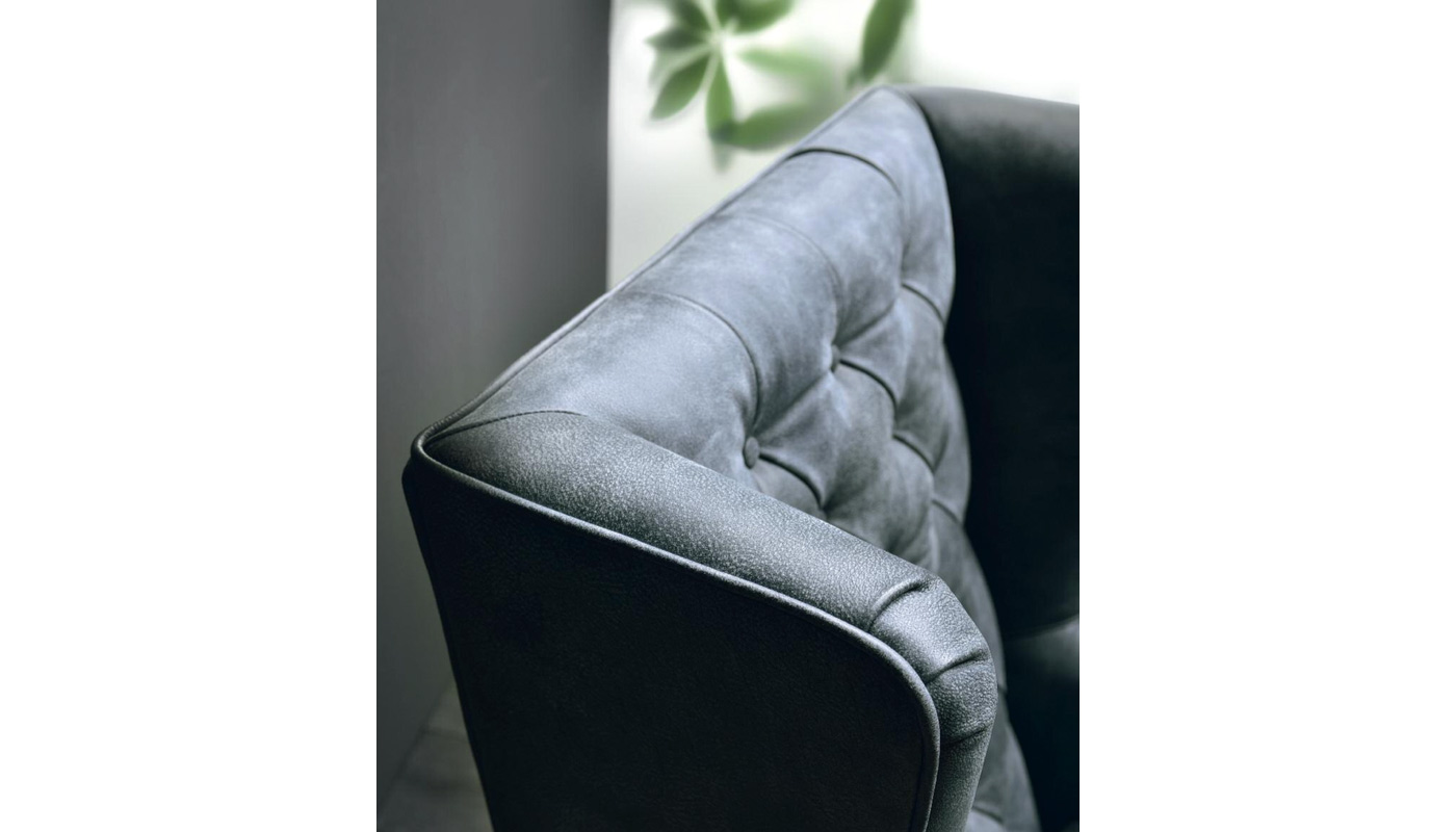 Un soffice schienale lavorato a mano con tecnica capitonnè avvolge la seduta con calda sensualità, donando all’oggetto un tocco glamour. Generose dimensioni e pulizia delle forme ne fanno un pezzo di grande impatto estetico.