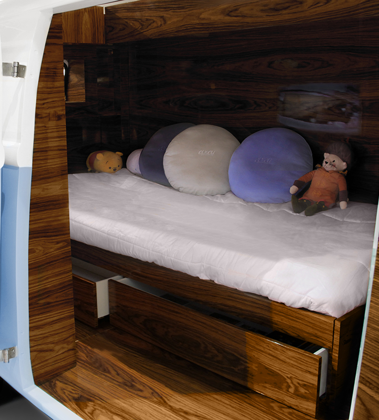 The exterior is produced in fiberglass with chrome-plated finishes and the inside is made of palisander wood veneer, containing several storage compartments, a bed, a TV, desk, mini bar and a sofa.
