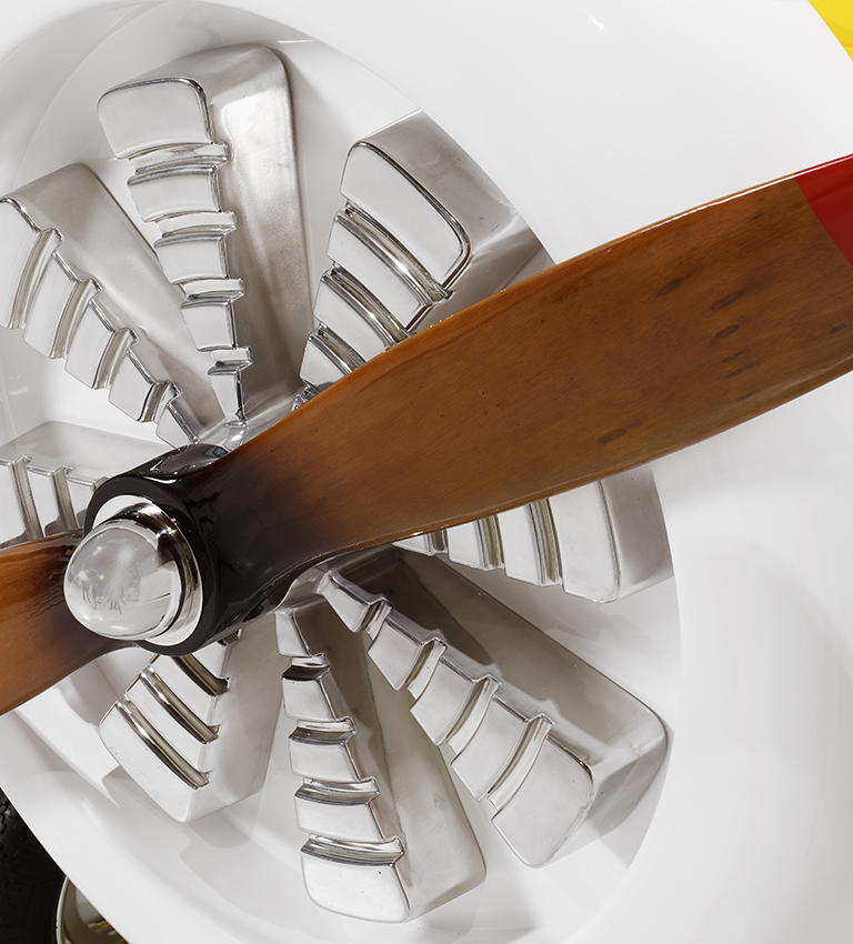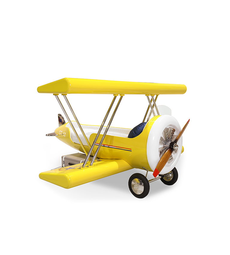 The body is entirely made of fiberglass with glossy varnish applied and chrome plated finishes in the engine and wheels. The Sky B Plane has several storage compartments and the top wing is designed to be used as a bookshelf.