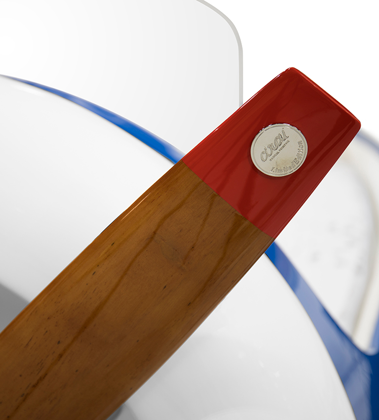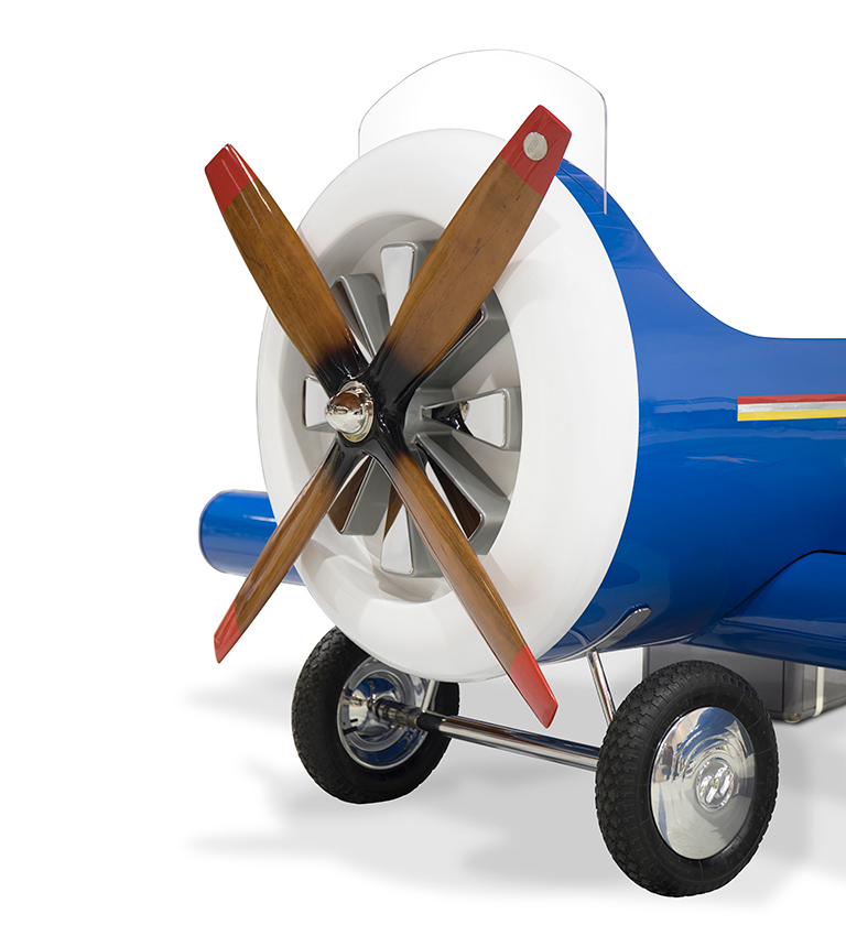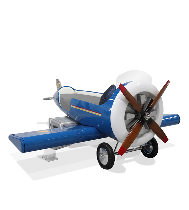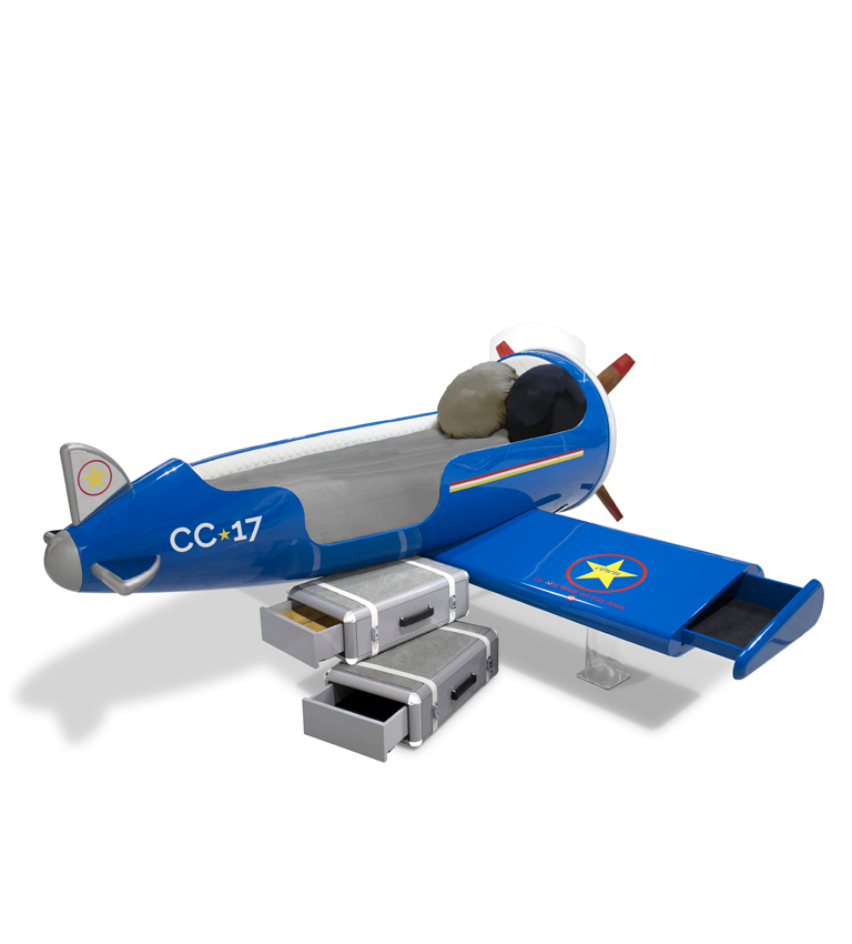 The body is entirely made of fiberglass with glossy varnish applied and chrome plated finishes in the engine and wheels. The decorative suitcases include secret storage compartments and allow an easy access to the bed. The Sky One Plane makes the crib-to-bed transition as painless as possible.