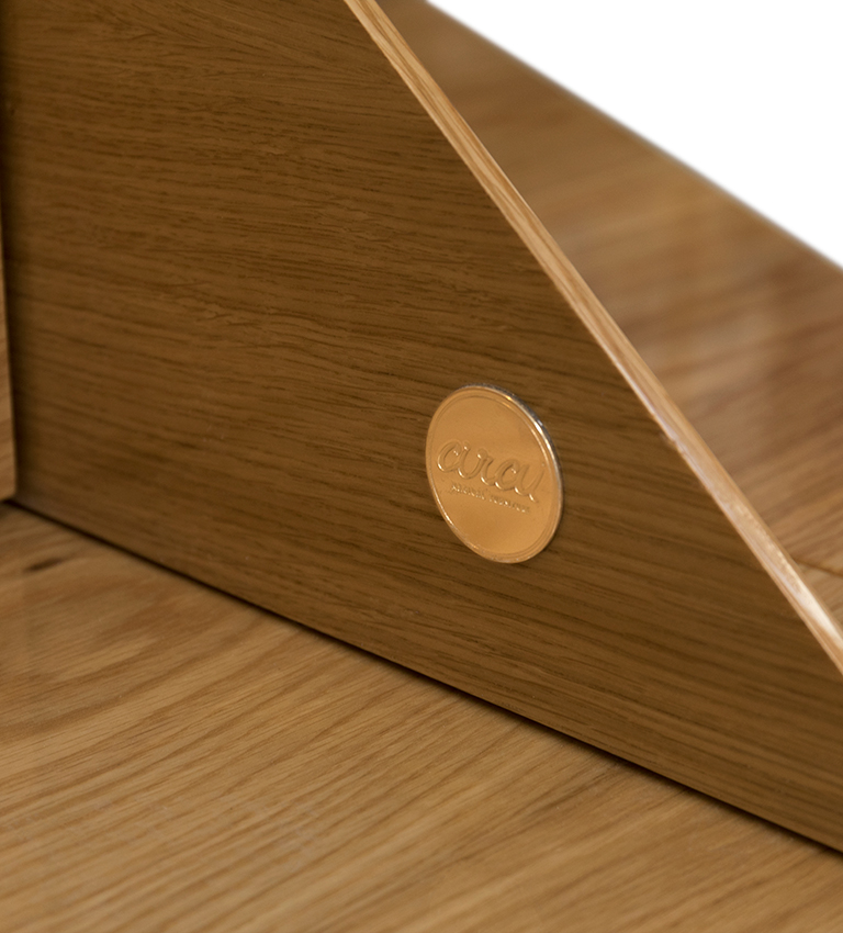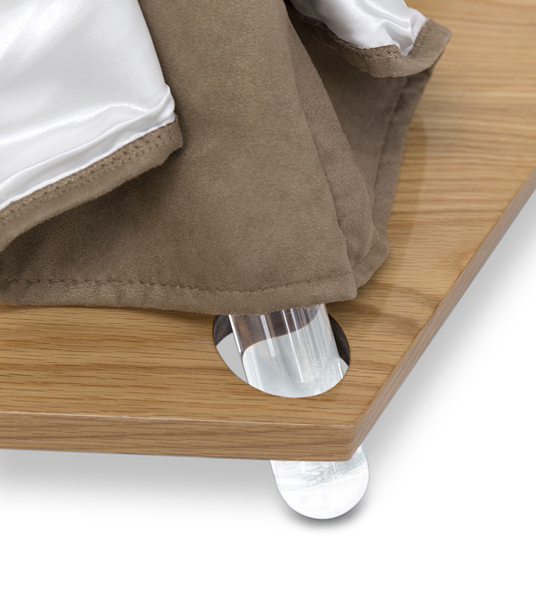 Constructed from a solid oak veneer, both on the base, bed and storage, it is then sup- ported by a 5-pole structure with a covering in synthetic leather, with peach skin texture.