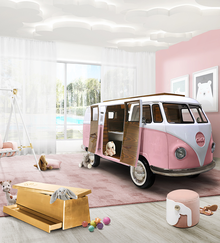 This exclusive toy box is built on wood, lacquered with metallic paint and has gold leaf finishes. It features a rotating cover and a secret compartment, for the most treasured kids’ goods.