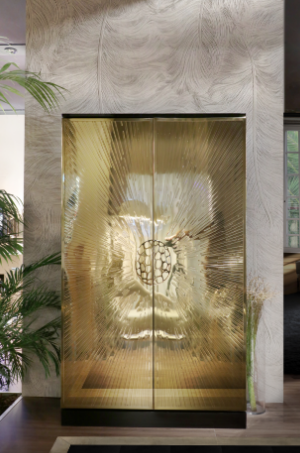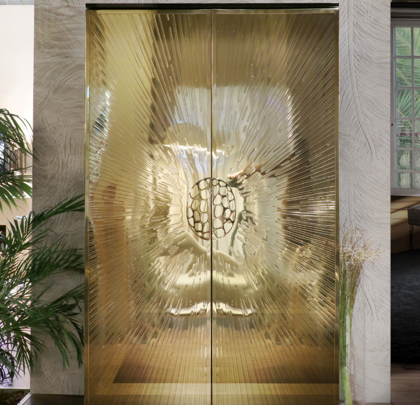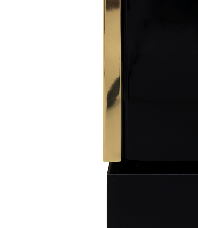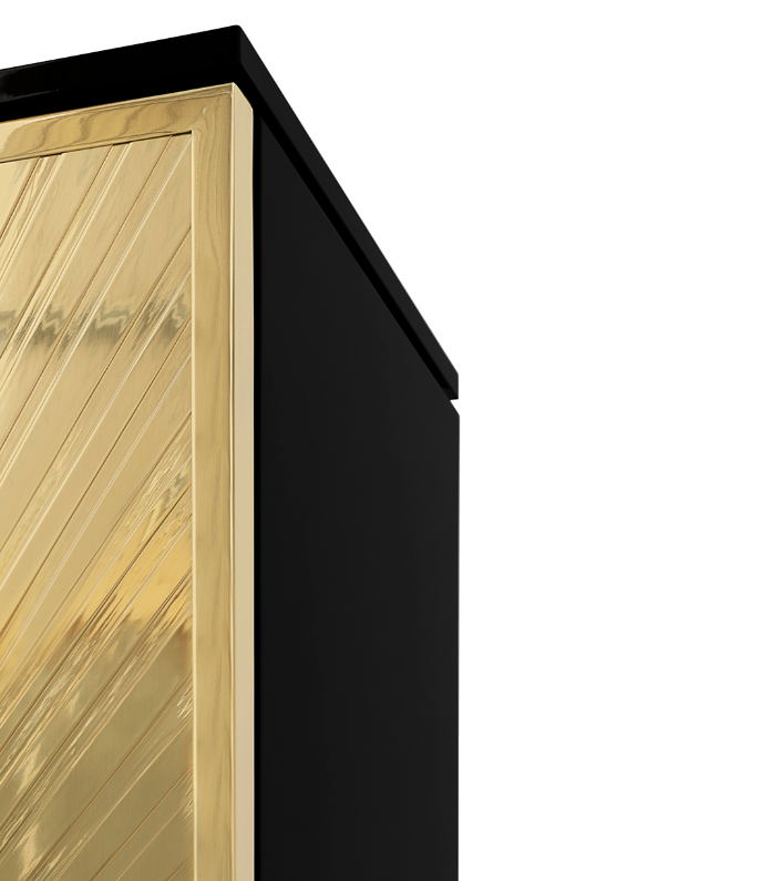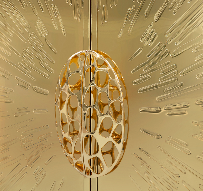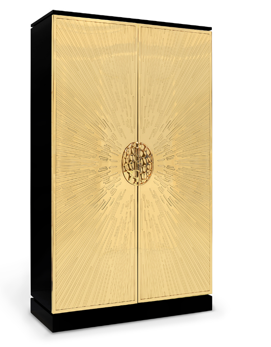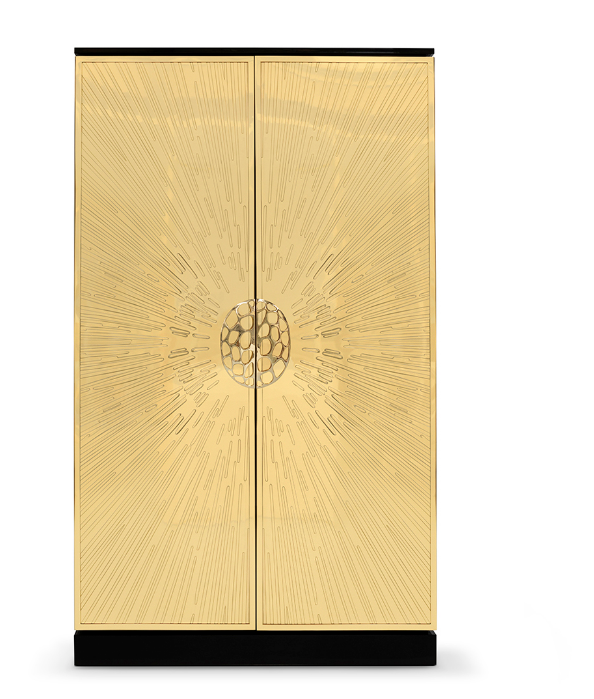 Dripping like honey with KOKET glamor, Heive is the Queen Bee of timeless black and gold cabinets. The alluring golden doors feature an exploding sunburst design enchanting you at first glance. For her majestic crowning touch, an enticing honeycomb beehive handle dares you to peek inside.